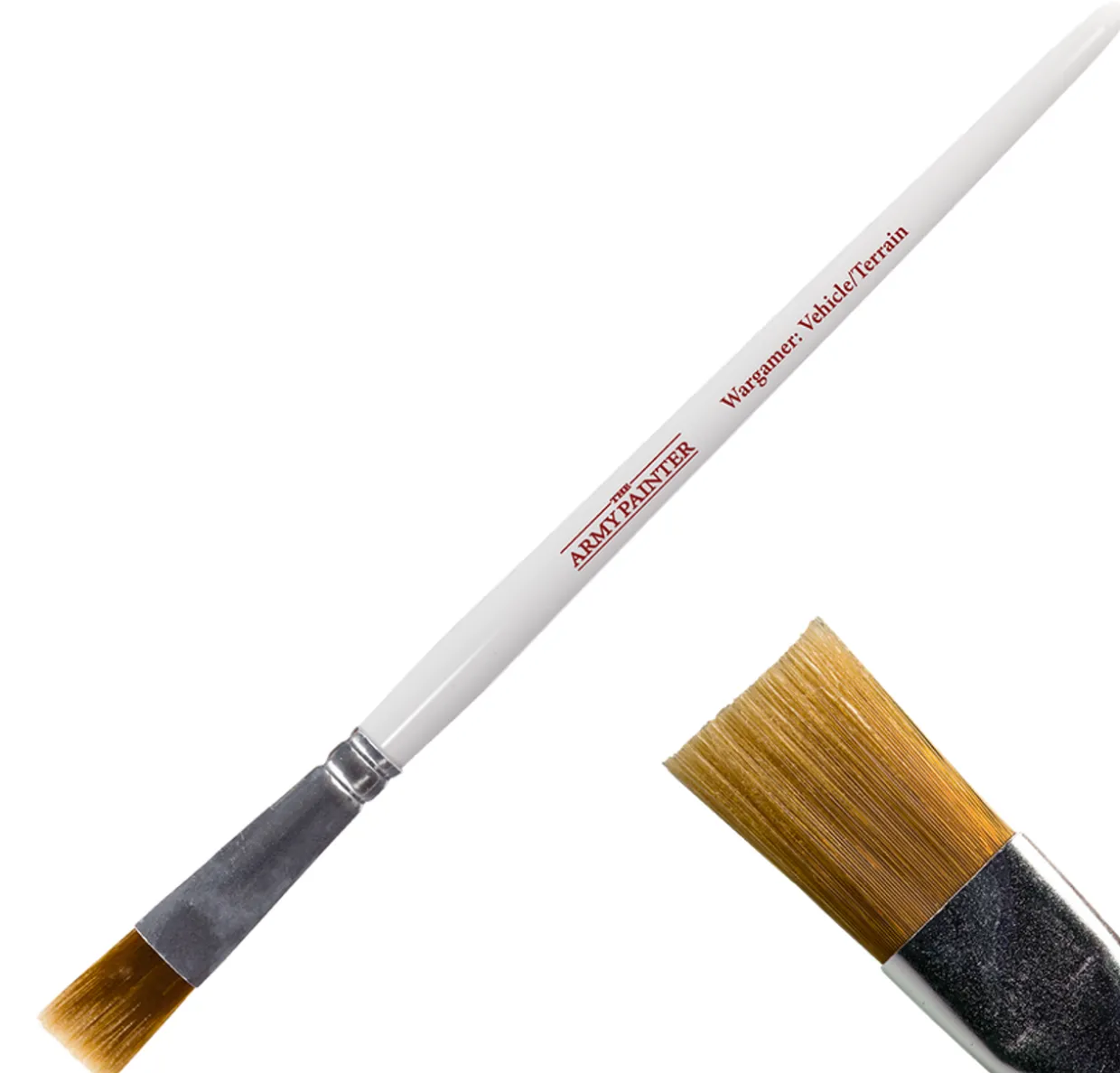 The Vehicle brush has a flat stiff end making it perfect for highligting edges on tanks and drybrushing anything from scenery to most vehicles. Also large monsters benefit from this brush where it is used as an enormous drybrush.