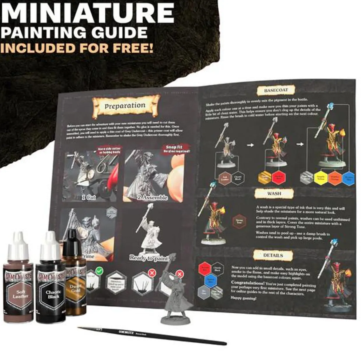 The GameMaster: Adventure Starter Role-Playing Paint Set includes 15 paints, consisting of 10 vibrant colours, 2 Effect paints, 2 Metallics, and 1 versatile Wash. You also get a Painting Guide, an Adventure Starter Guide, a GameMaster Starter Brush, and 5 snap-fit miniatures – FREE!