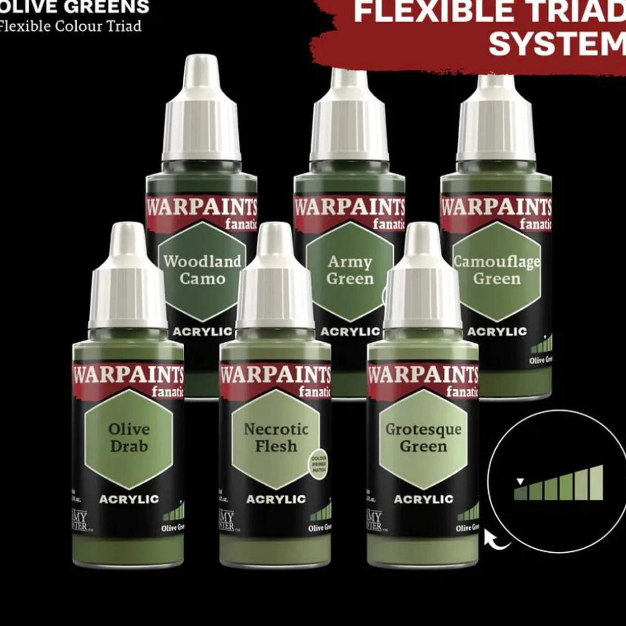 Each paint is part of a Flexible Colour Triad System: a segment, or family, of paint colours that are made using the same root colour. Inside each Flexible Colour Triad are six colours that range from dark to light with a consistent hue. With this system, you can easily select paints that create a natural colour progression on your miniatures.