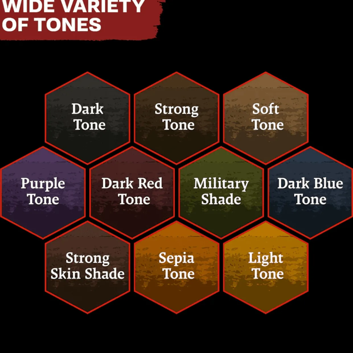 Inside the Warpaints Fanatic Wash Set, you will find 10 Washes in tones that range from a rich Dark Tone to a vibrant Dark Red Tone, and many shades in between. With this set, there is sure to be a colour or tone to meet the needs of your next project. And if not, our Washes are 100% mixable, making your go-to shading solution options endless!