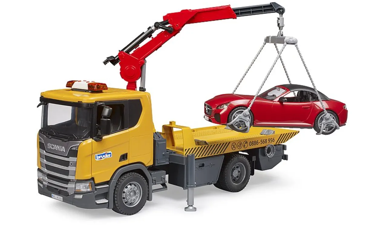 The Scania Super 560R Tow Truck with Roadster from the Bruder Truck collection at Wonderland Models.