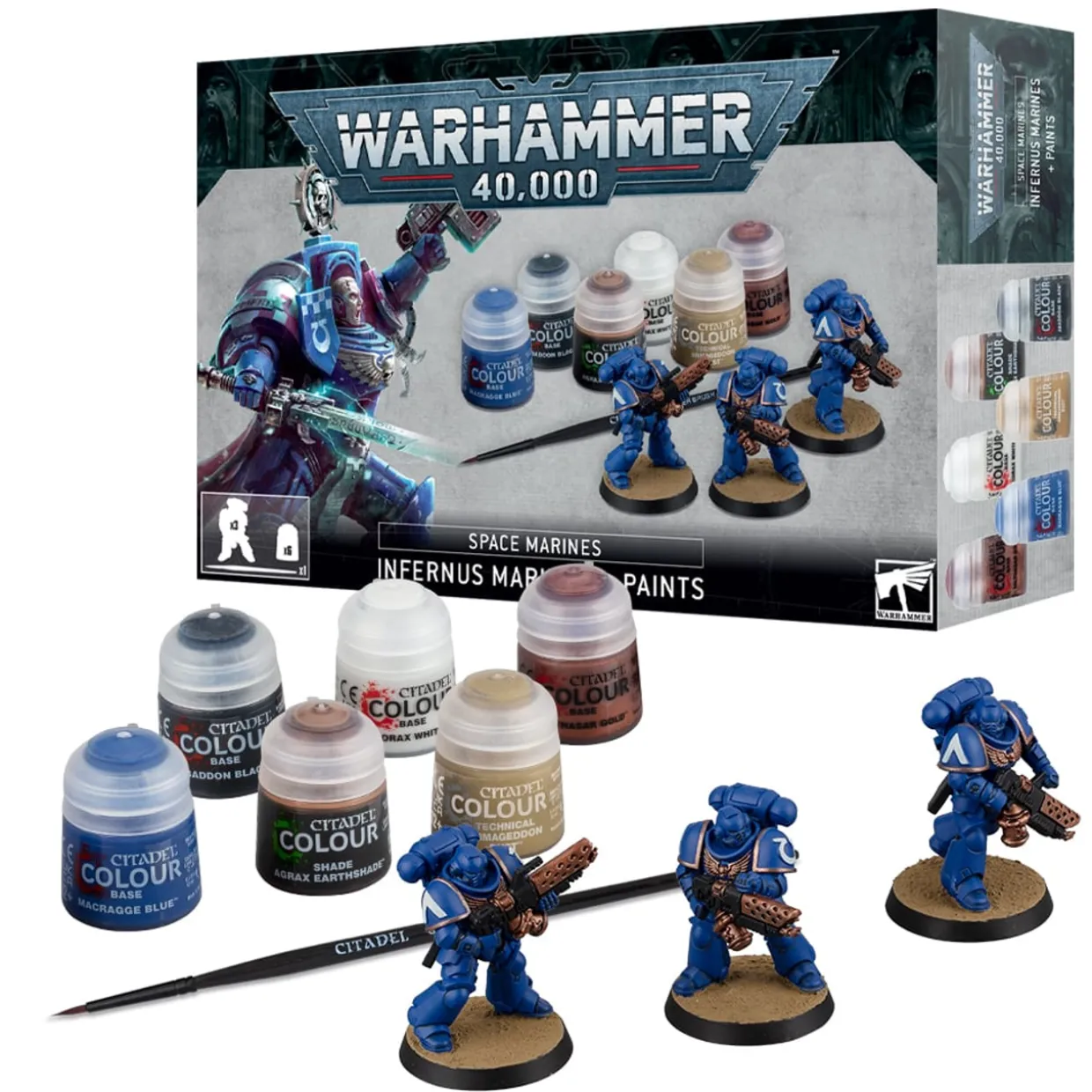 Get started with the painting aspect of the Warhammer hobby with this Infernus Marines + Paints set, which includes three push-fit Infernus Marines with embossed Ultramarines shoulder markings, and five paints – Corax White, Macragge Blue, Balthasar Gold, Abaddon Black, Agrax Earthshade, and Armageddon Dust – plus a Citadel starter brush.