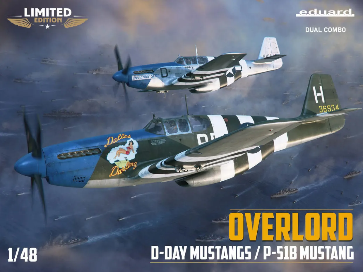 The Eduard 1/48 Overlord: D-Day Mustangs Dual Combo accurately recreates the iconic American fighter aircraft flown during World War II. This plastic model kit requires paint and glue to complete. This kit contains parts for 2 complete models.