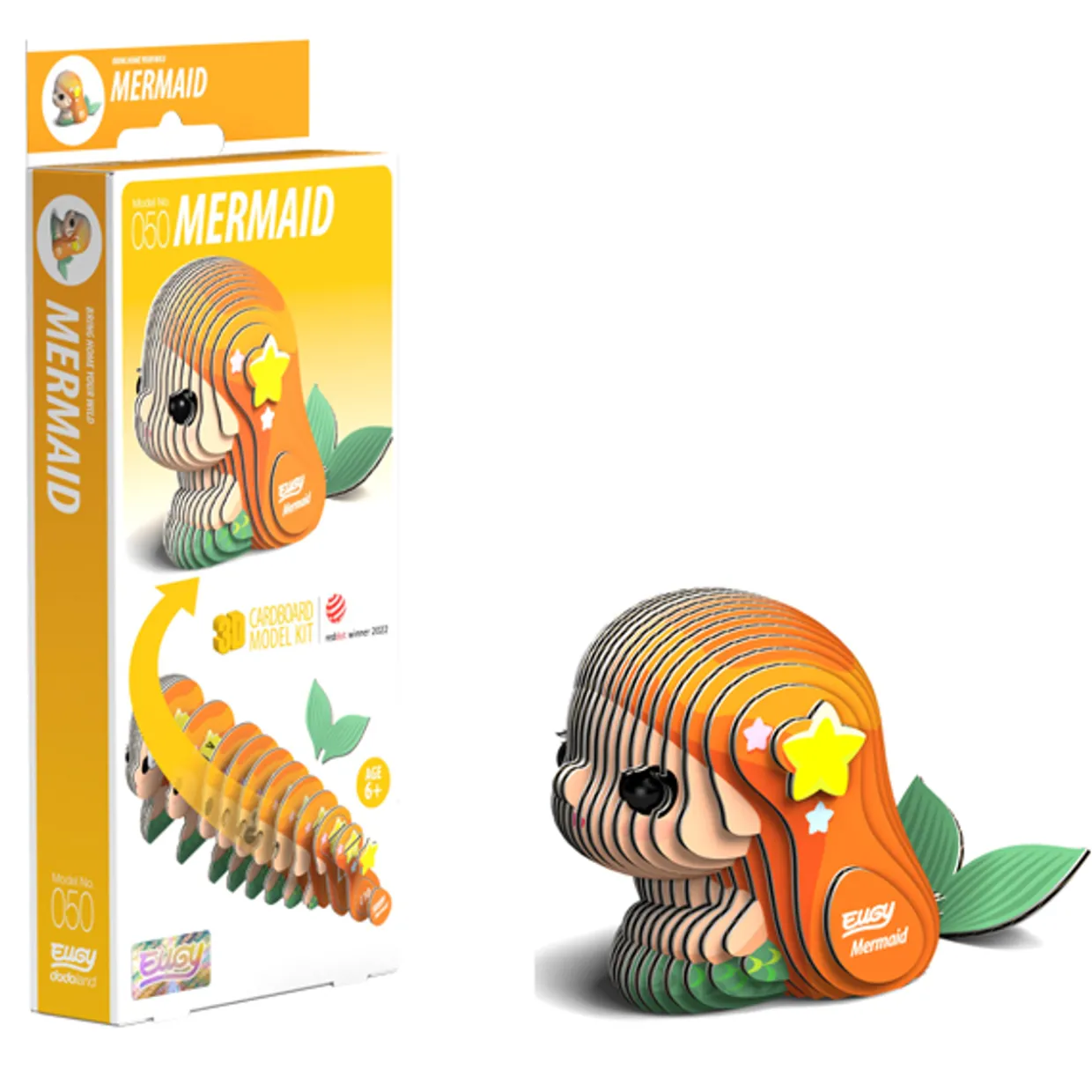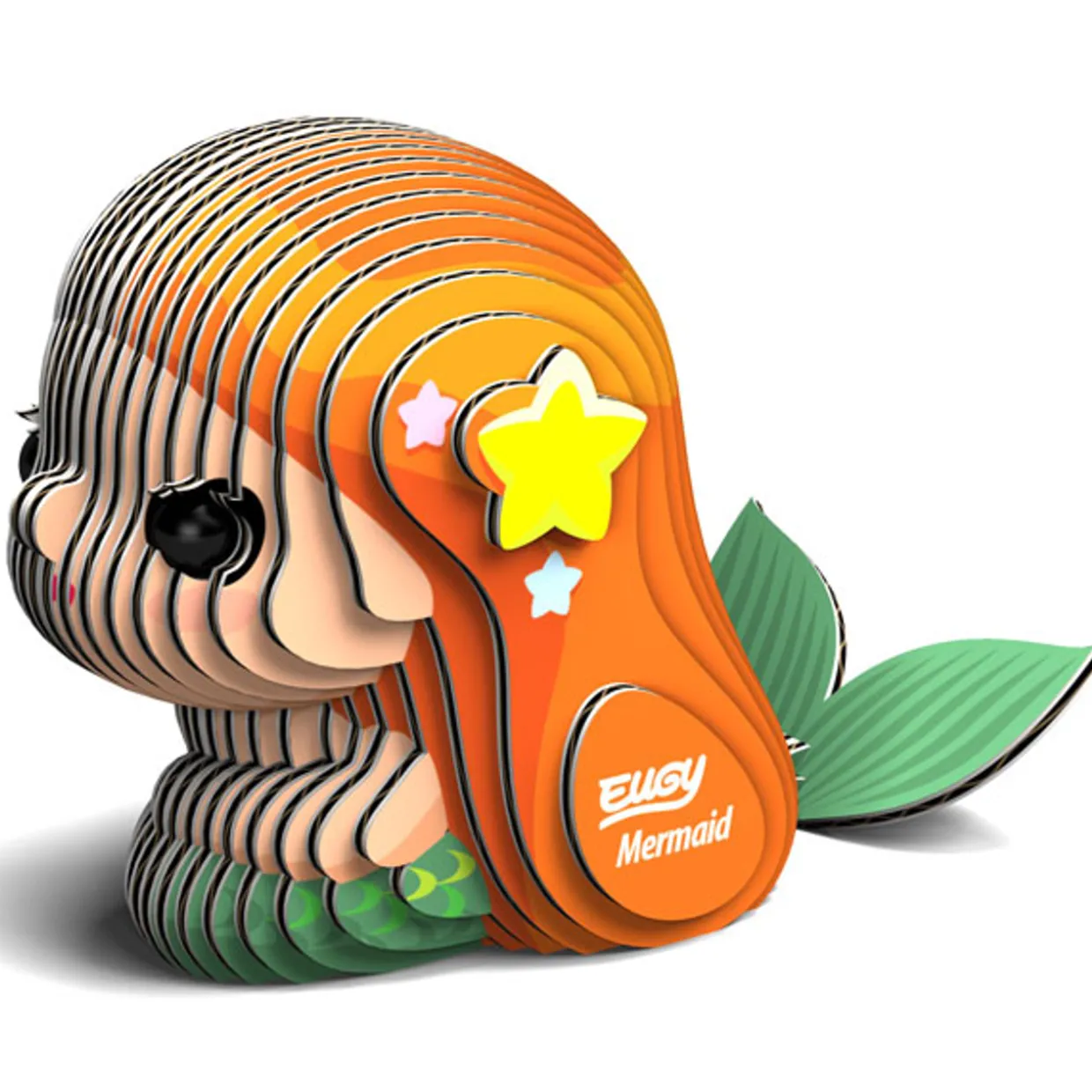 The Eugy Mermaid is a 3D puzzle made from cardboard, designed for children ages 4 and up.