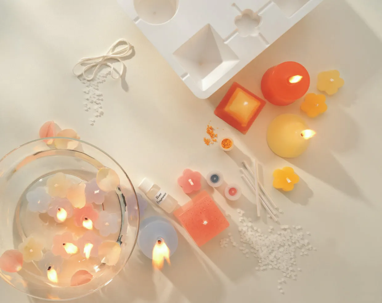 Candlemaking Craft Kit contents wax pellets, candle moulds, coloured dyes, fragrance oil, bulb pipette, wicks, wick rods, mould sealer and full instructions.