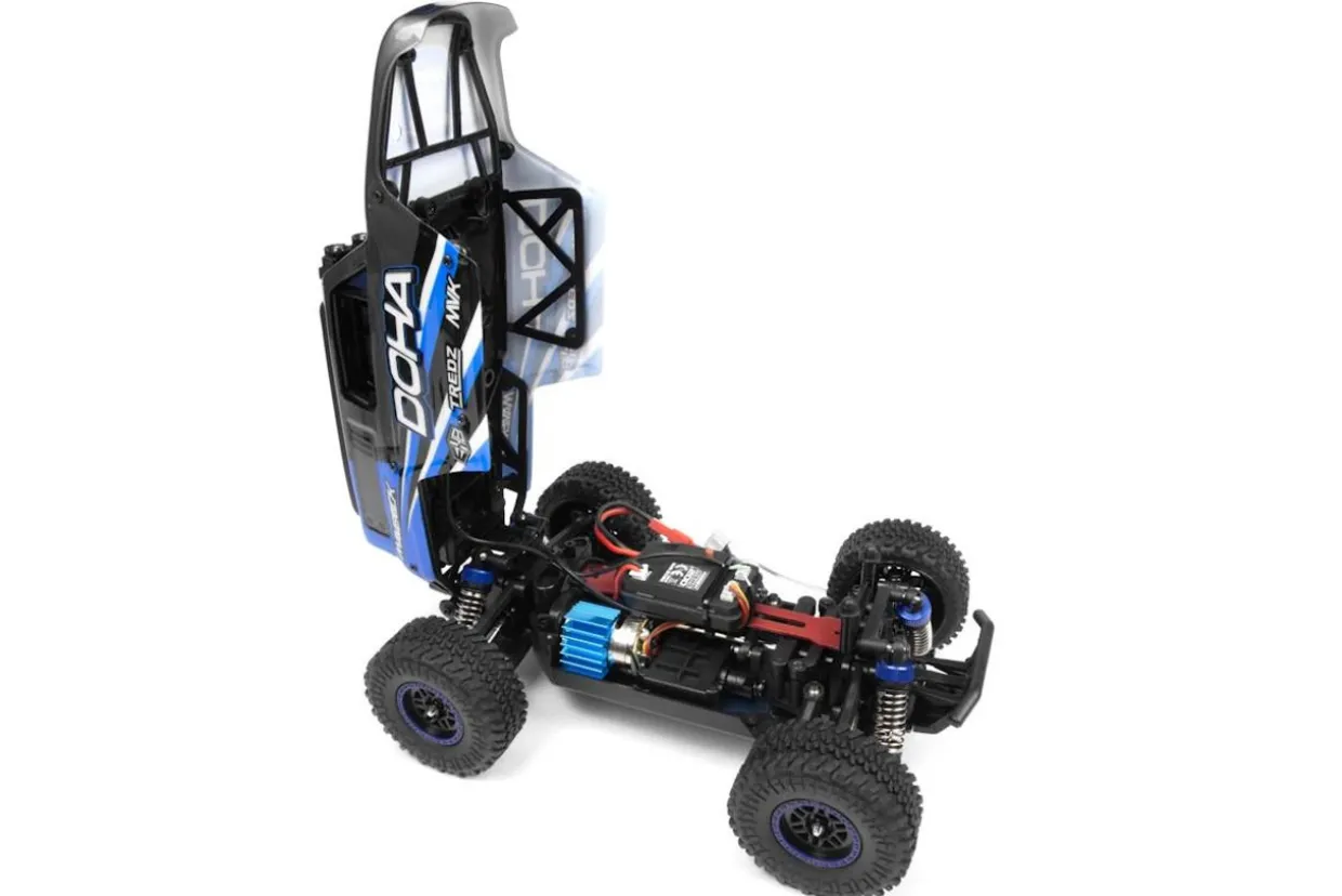 The DOHA features a durable shaft drivetrain and 3-gear differentials, ensuring optimal power distribution for exceptional stability and precision handling across diverse terrains. Its reinforced cage design, coupled with a custom screen-printed, rear-hinged Desert truck body, not only enhances its visual appeal but also provides easy access to the battery tray. Available in four distinctive color options, the DOHA allows for a personalized touch.