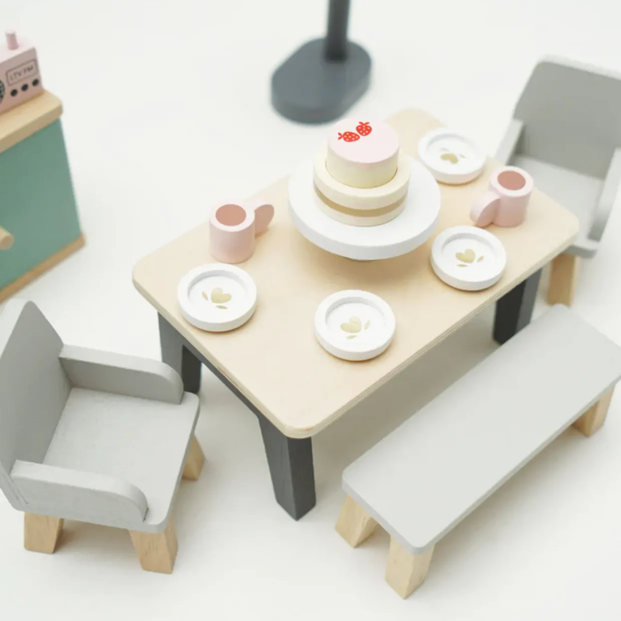 The Daisylane Dining Room set is a new release from the Le Toy Van Daisylane Deluxe range of dolls house furniture which is suitable for all 1/12 scale dolls houses. This furniture set comes ready built and ready painted and includes the furniture as illustrated.