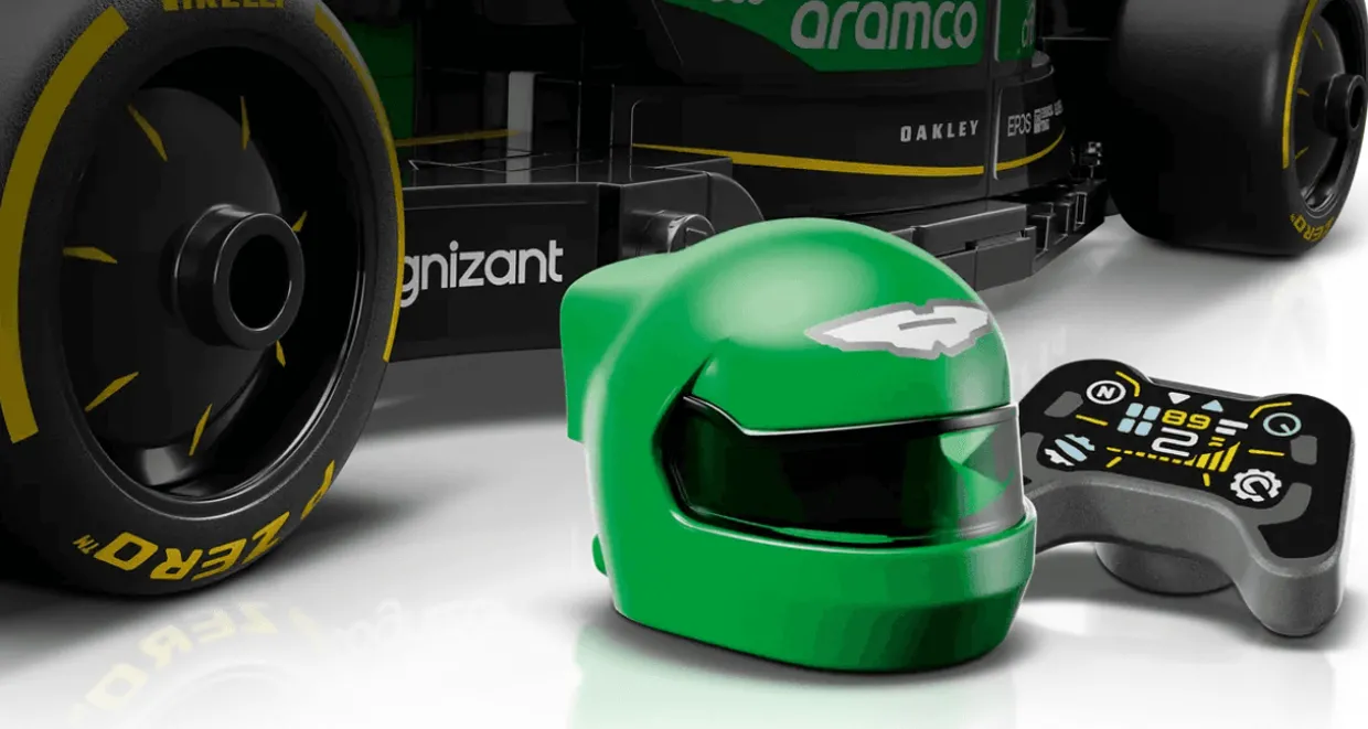 The Aston Martin Aramco F1 race car features a cockpit that opens by lifting the halo bar, a rear wing, wishbone suspension, sponsor stickers and wider rear tires imprinted with“Pirelli.” The vehicle kit comes with a driver minifigure in an Aston Martin Aramco F1 outfit and a winged helmet to place inside the cockpit and stage races.