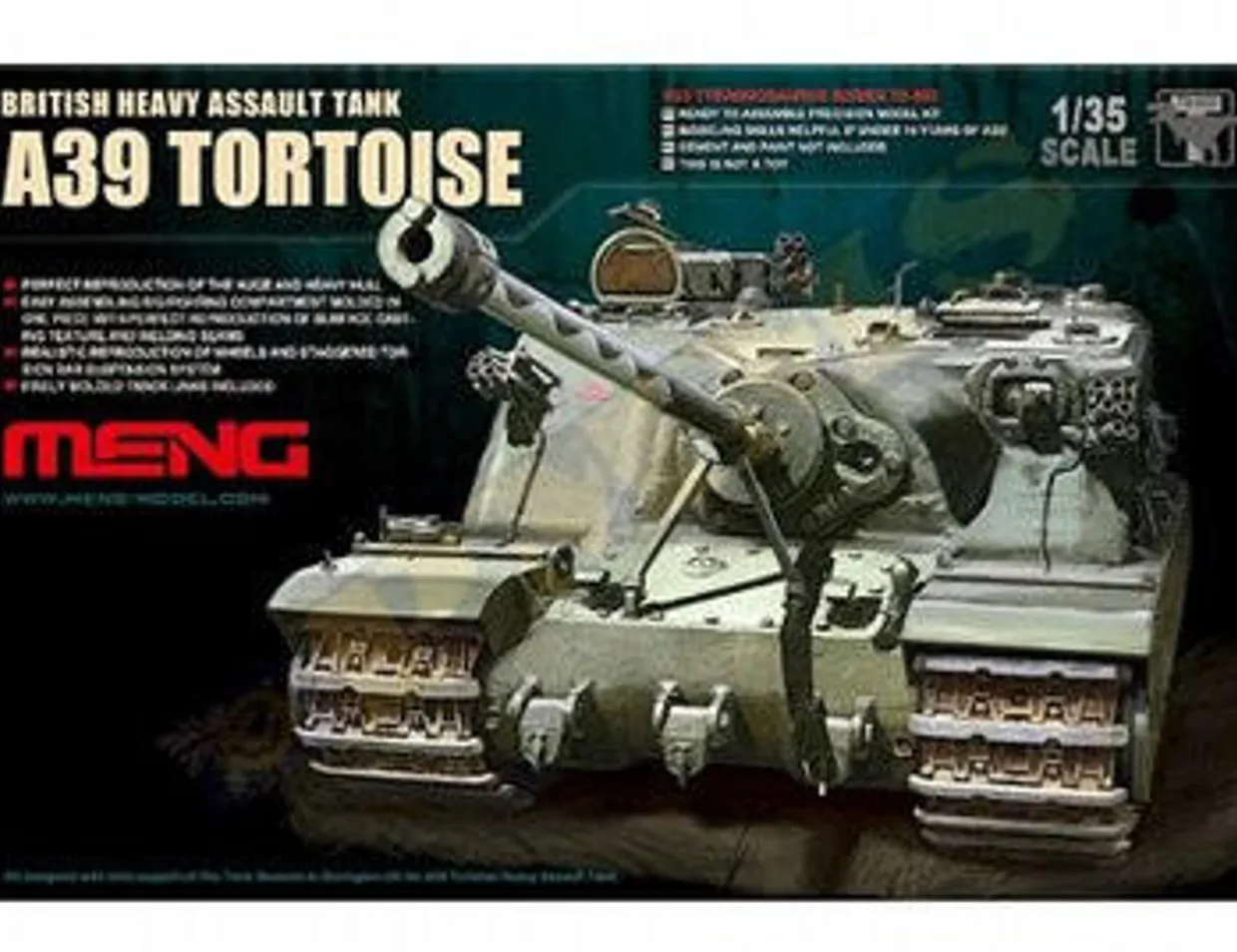 In order to present modelers a perfect A39 Tortoise model kit, MENG extended its development period, resulting in a late release. With the kind support of the Tank Museum in Bovington UK, this kit reproduces the real vehicle as much as possible. The huge and heavy hull, big fighting compartment molded in one piece, realistic wheels, staggering torsion bar suspension system and fine track links will surely bring you endless joy!