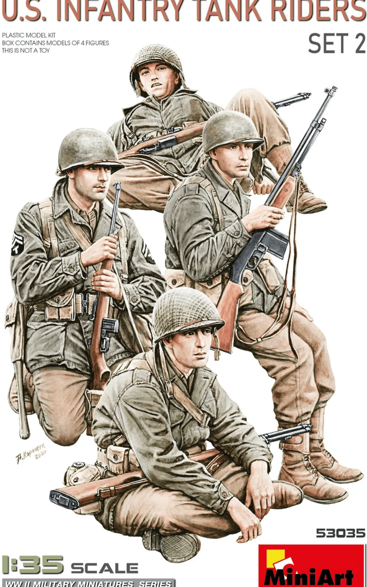 Enhance your World War II dioramas with the 1/35 scale US Infantry Tank Riders Set 2 from MiniArt. This highly detailed plastic model kit accurately recreates American soldiers from WWII, perfect for adding realism and action to your military displays.