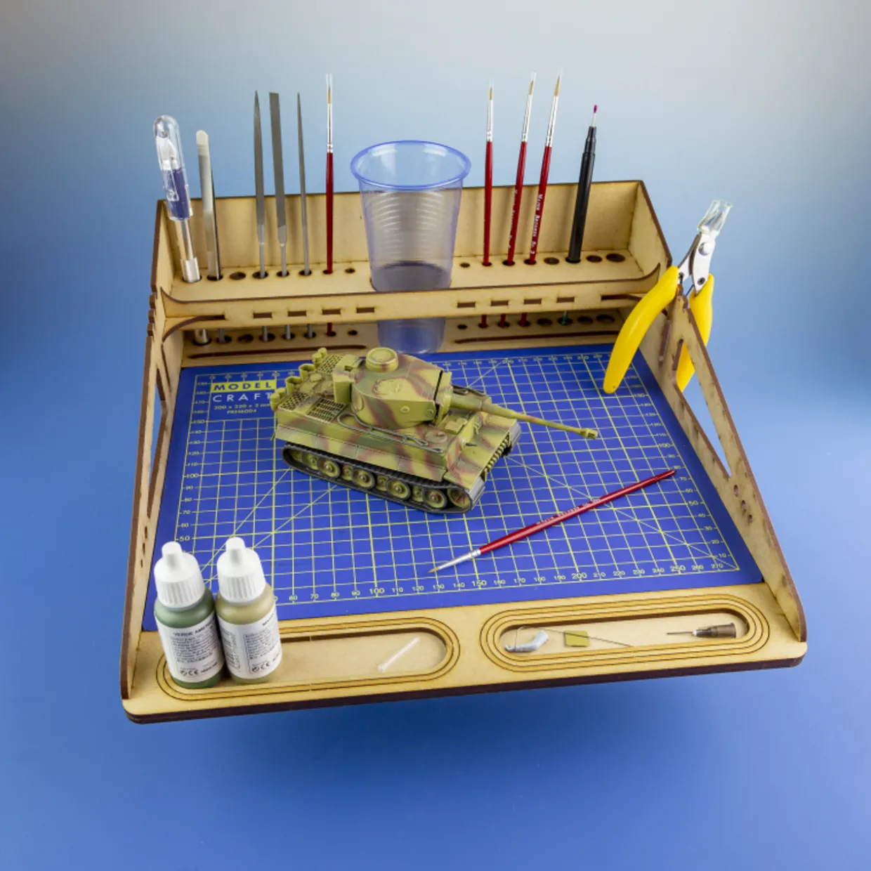 The Modelcraft Work Station A4 with Cutting Mat is a laser cut plywood organiser for all your tools, paints and includes a Modelcraft A4 Cutting Mat.