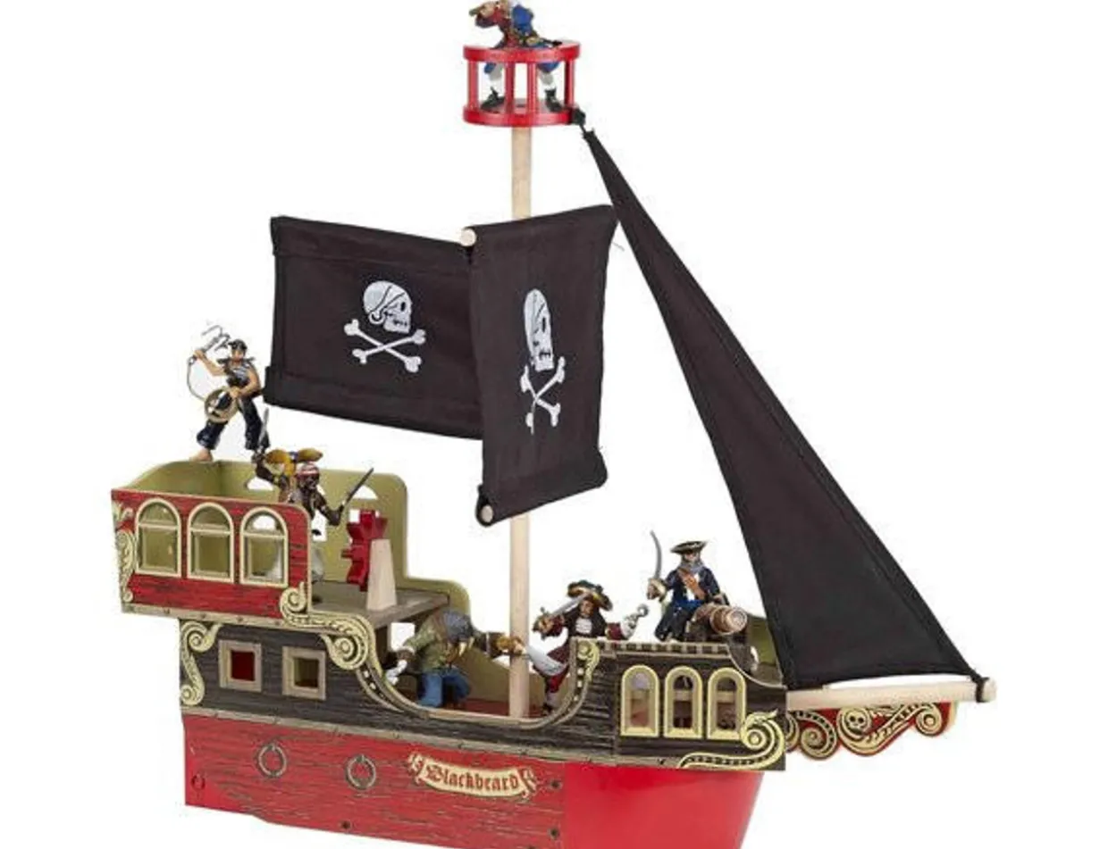 The Papo Wooden Pirate Ship – just one of many great playsets from our toy pirates range. This swashbuckling ship would be idea fun for any young pirates to be. Painted red and black displaying the name Blackbeard after the famous pirate of old. Add the Pirate Playmat to create a great pirate playscene!