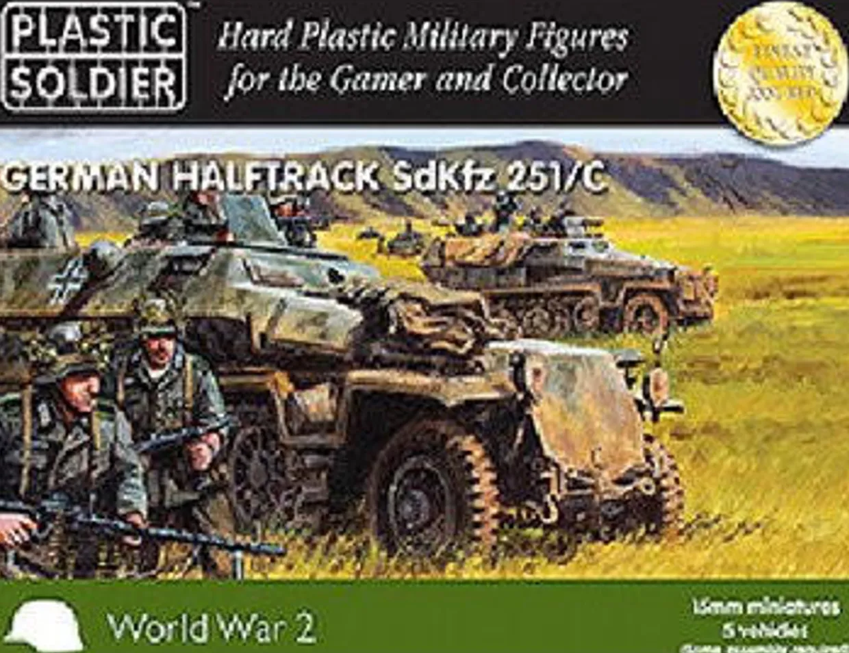 The Plastic Soldier Company 1/100 Sd.Kfz.251 Ausf.C Half-track from our 1/100 (15mm) military vehicle model kits range range accurately recreates the real-life German armoured half-track from World War II. This plastic model kit requires paint, and may require glue, to complete.