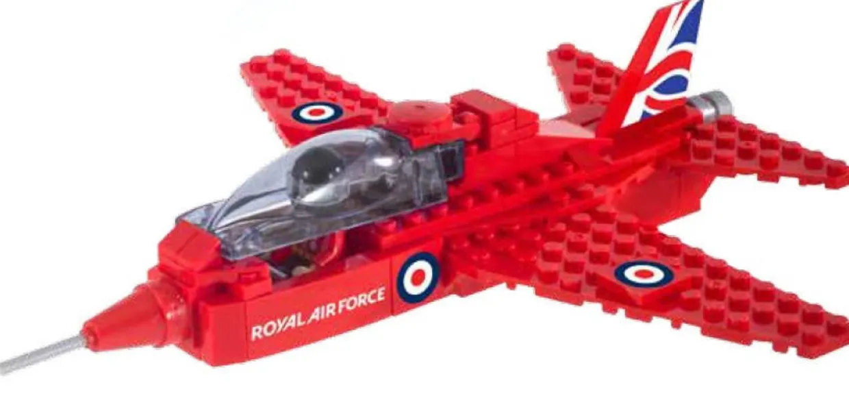 New from the Humatt range of Royal Air Force Aircraft toys and Models is the Red Arrows Display Jet building brick model kit. This click together brick set does not require paint or glue, includes a pilot figure, a sticker sheet with RAF Decals and is compatible with other famous building brick brands!