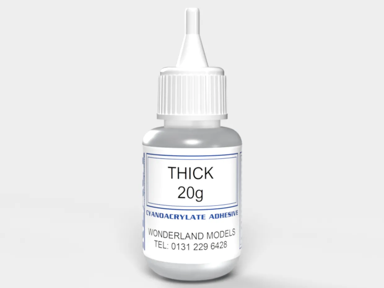 The React Superglue Cyanoacrylate Thick in a 20 gram bottle is perfect for all model making needs. This super glue is synonymous around the world with strength, quality, and durability. Superglue forms the strongest bonds on clean breaks of non-porous material such as plastic, rubber, and metal, and once exposed to air it bonds instantly and sets in seconds.