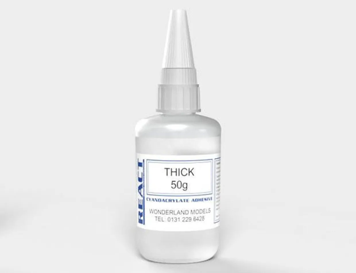 The React Superglue Cyanoacrylate Thick in a 50 gram bottle is perfect for all model making needs. This super glue is synonymous around the world with strength, quality, and durability. Superglue forms the strongest bonds on clean breaks of non-porous material such as plastic, rubber, and metal, and once exposed to air it bonds instantly and sets in seconds.