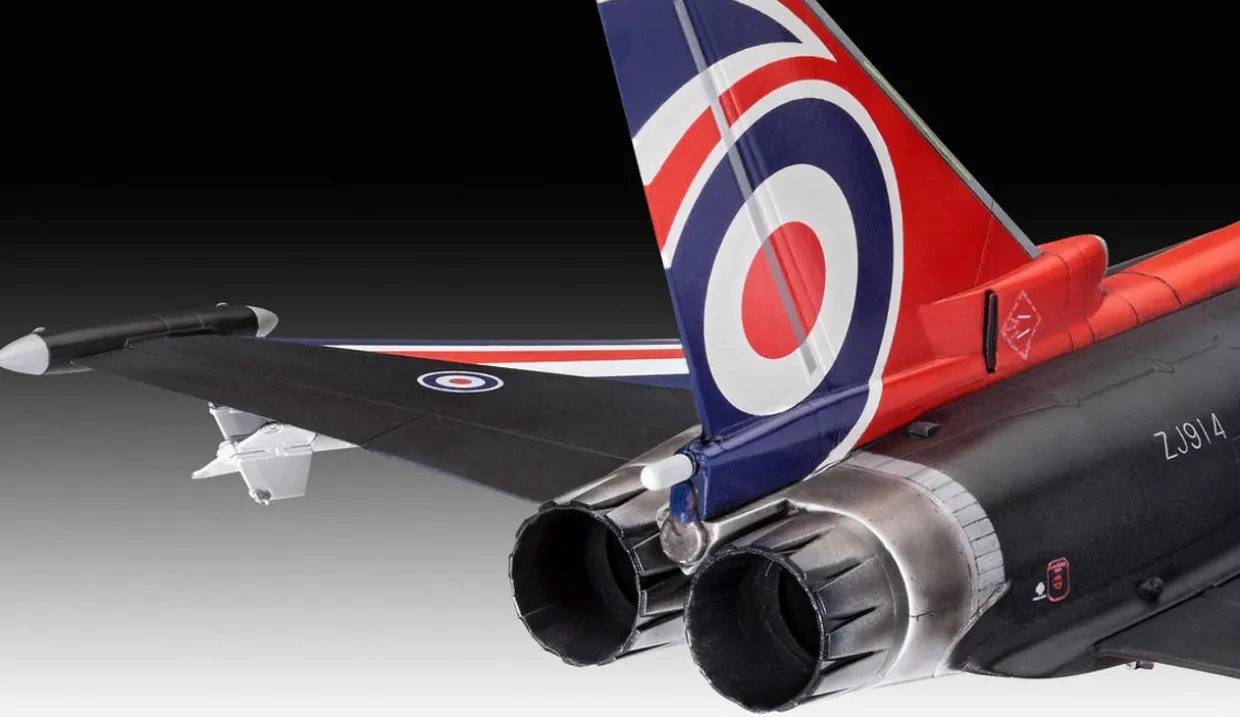 The Revell 1/48 Eurofighter Typhoon Black Jack from our 1/48 scale aircraft model kits range accurately recreates a real-life RAF Display fighter jet. This plastic model kit requires paint and glue to complete.