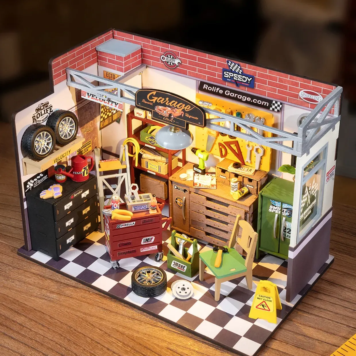 Rolife brings you what everybody wants in their home: the perfect garage workshop. Built with stunning accuracy, this miniature wonder captures your love for DIY with precisely crafted shelves, drawers, cabinets, boxes, wheels, hoses, tools, gloves, and accessories. We have details nailed down like the folding wet floor sign, the peg board, the toolbox, the watering can, the adhesives, the potted plant, the bricks, the classic chessboard floor, plus much more. The room is well-lit by an overhead LED lamp. Every space is optimized as is typical of the ideal home garage. The colors and textures depict a cheery and productive space where fantastic ideas become reality.