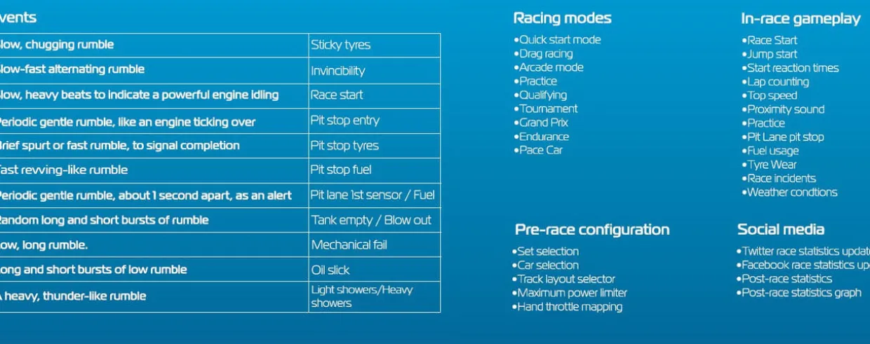 Set up each race by choosing the race type, driver names, number of laps and toggle additional features on or off such as Yellow Flag mode, Fuel, Tyre Wear, in-race damage and many more! Customise individual throttle mapping and car handling characteristics before you head out on the track to test your skills and challenge your opponent.