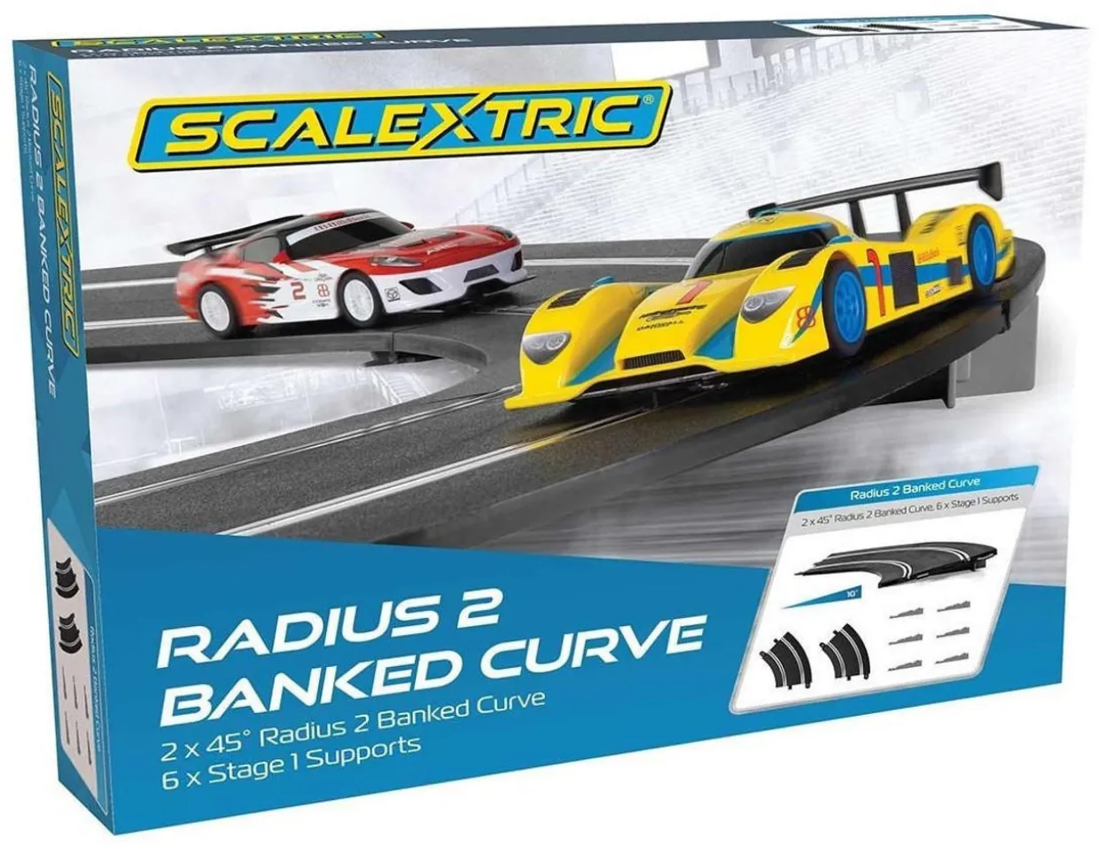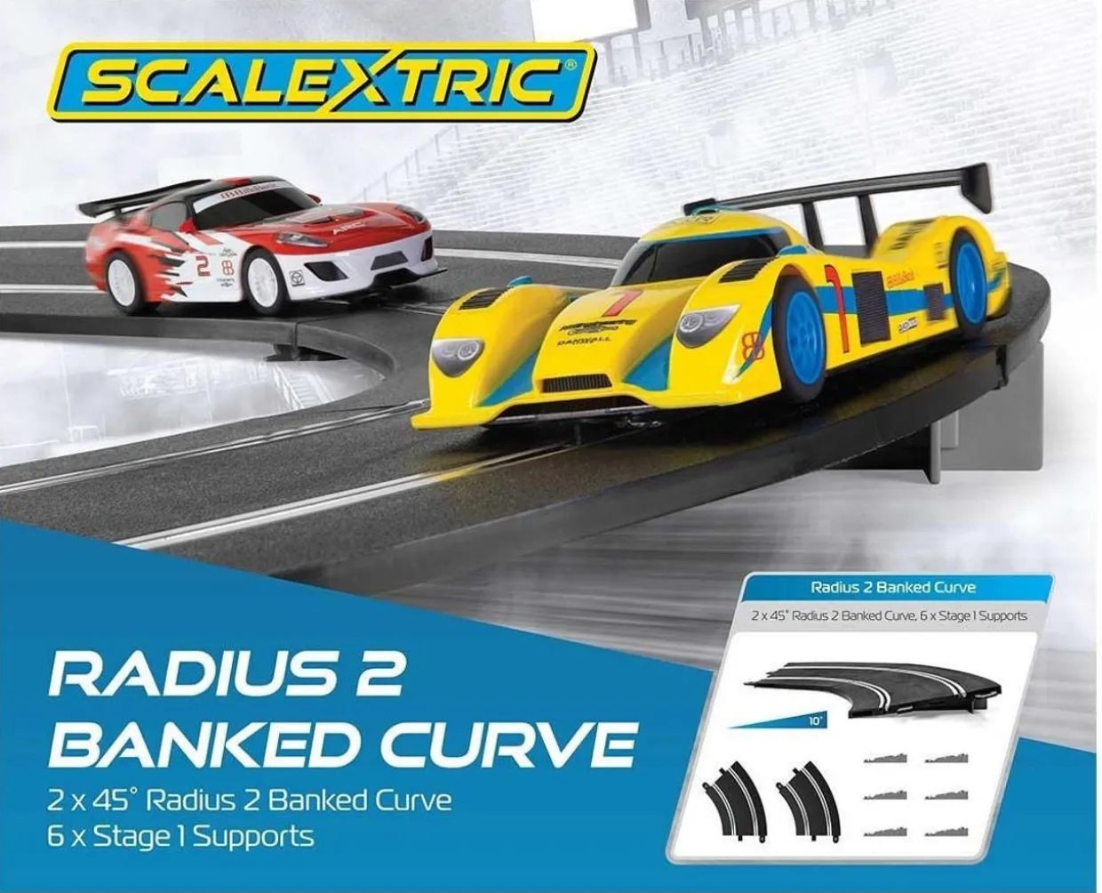 The Scalextric C8296 Banked Curve R2 45 Deg can be used to create Indianapolis IRL and NASCAR style circuits to replicate todays racing world or recreate 1930’s circuit features such as Brooklands and other famous banked tracks.