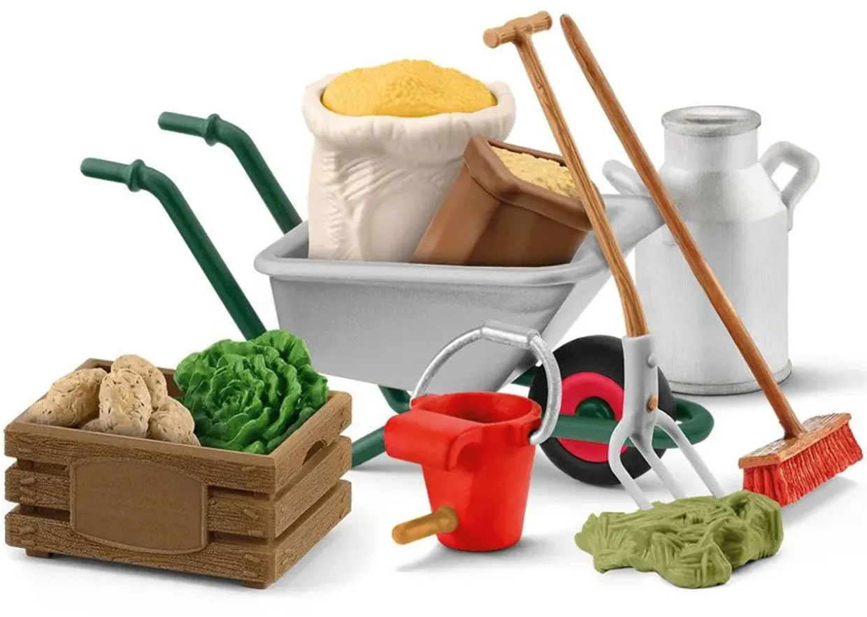 The lovingly designed stable care accessories from schleich include food for all the farm animals. The horse gets the oats, while the pigs look forward to a meal of potatoes and lettuce. The little calf is still on a milk diet with its special bucket with drinking device. The farmer tosses the hay for the cows with the pitchfork and brings it to the animals with the wheelbarrow.