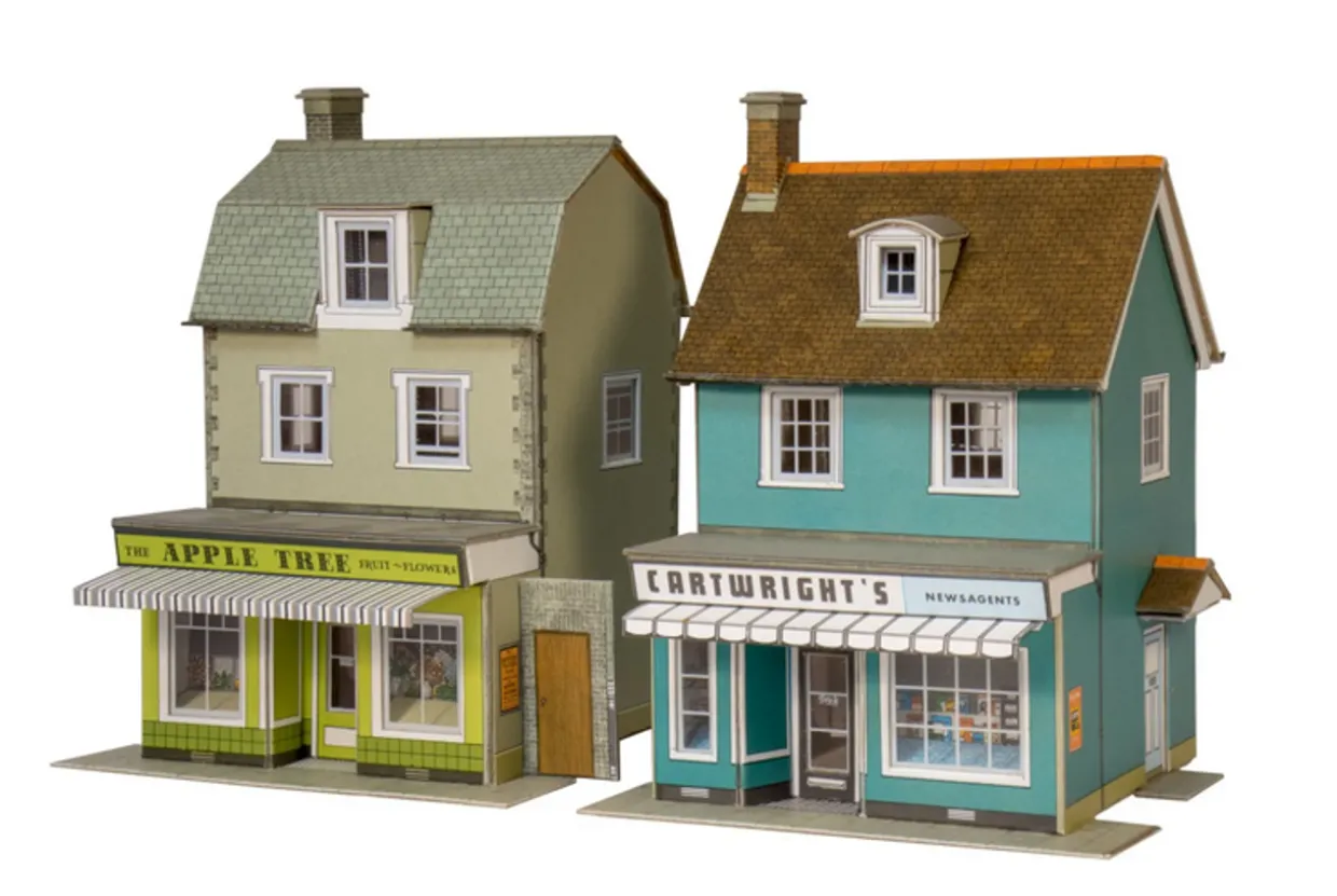 The Superquick 1/76 Two Country Town Shops provides a highly detailed pre-coloured and pre-cut papercraft card model – ideal to add to your OO gauge model railways layout.