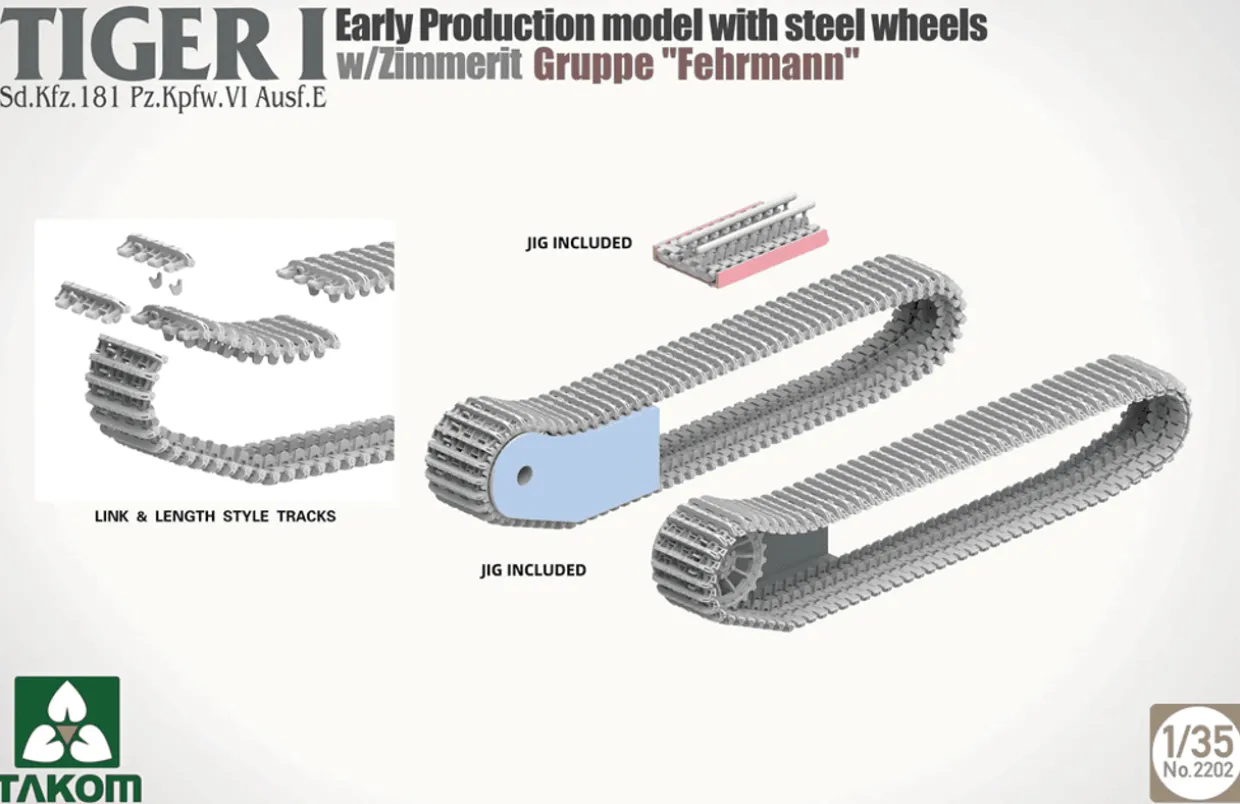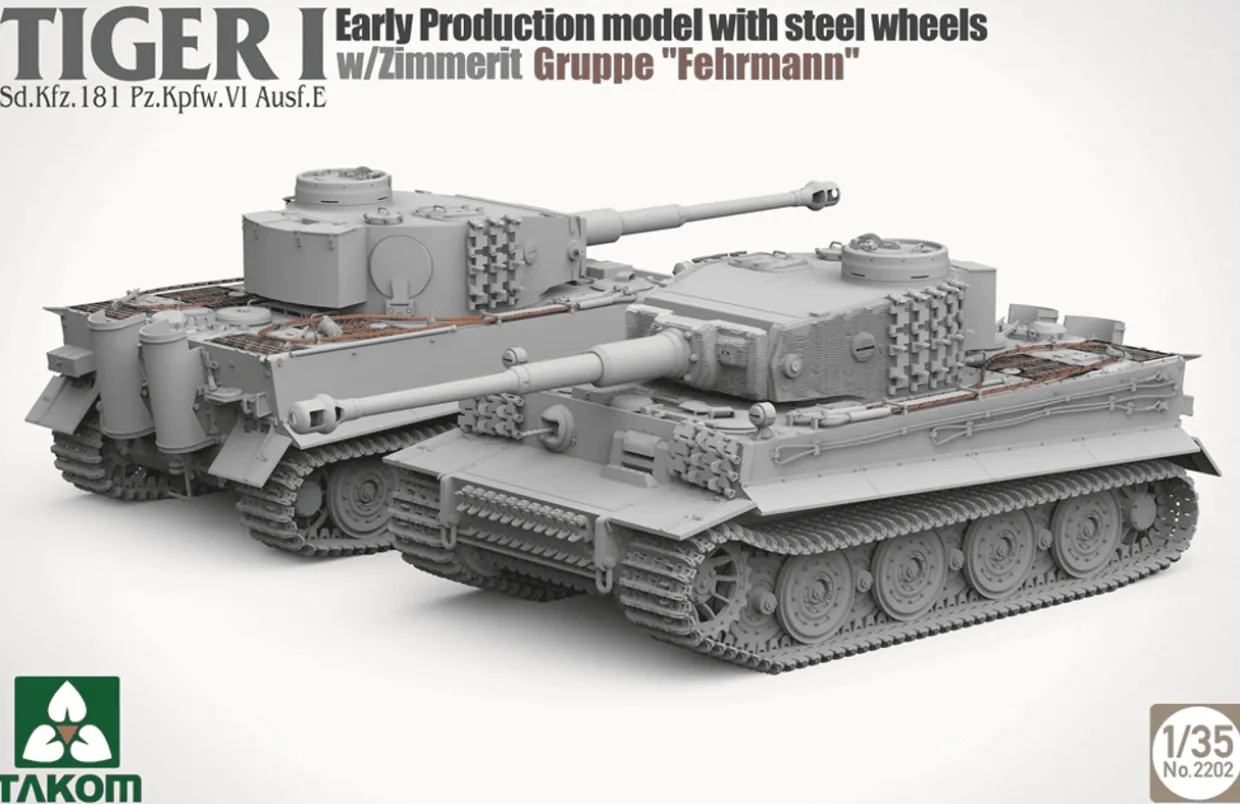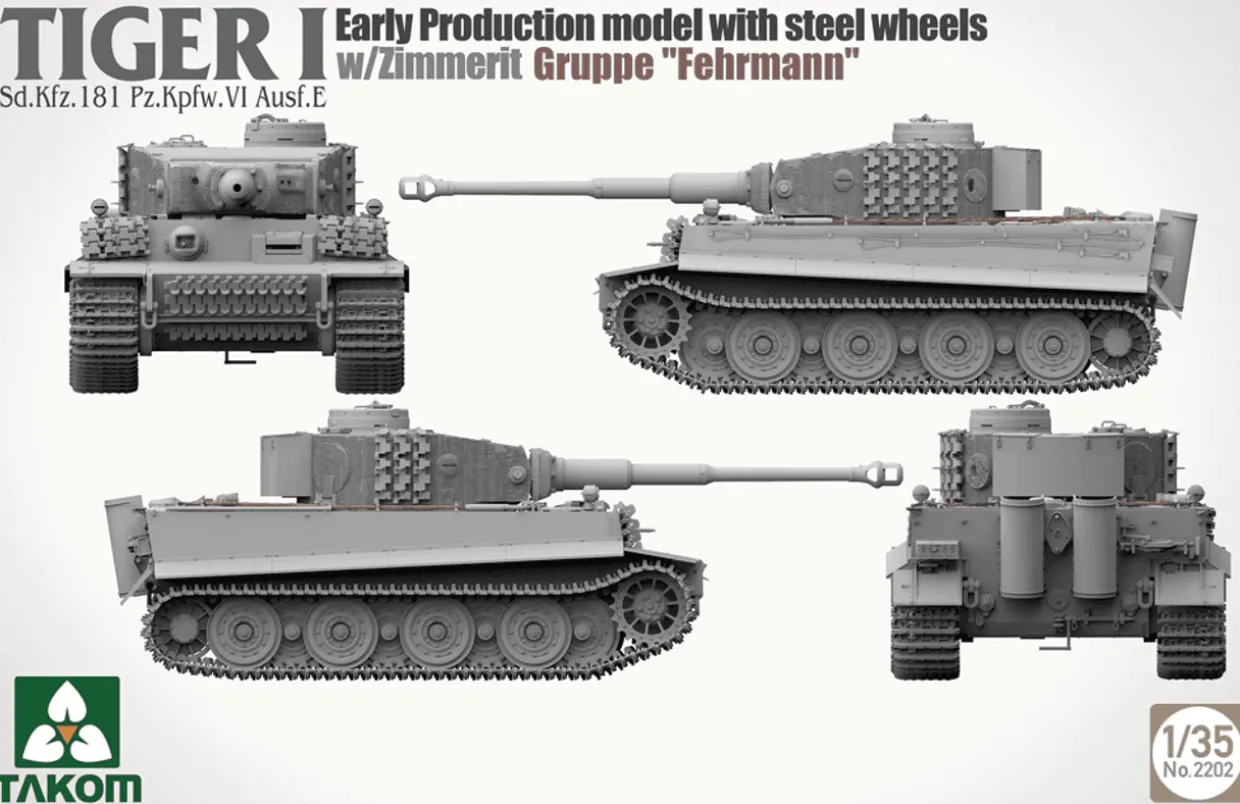 The Takom 1/35 Pz.Kpfw.VI Ausg.E Tiger I Gruppe Fehrmann Early Production with Steel Wheels from our 1/35 scale military vehicle model kits range range accurately recreates the German heavy tank from World War II. This plastic model kit requires paint and glue to complete.