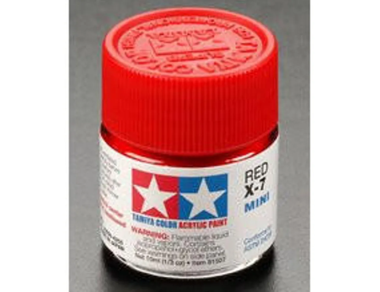 The Tamiya Mini X-07 Red Acrylic Paints come in 10ml bottles and are water-soluble and non-toxic. They are suitable to paint plastic model kits and come in three finishes, gloss, flat and translucent. The Tamiya Acrylic Paint range can be brushed straight from the tub, or thinned to be used in an airbrush.