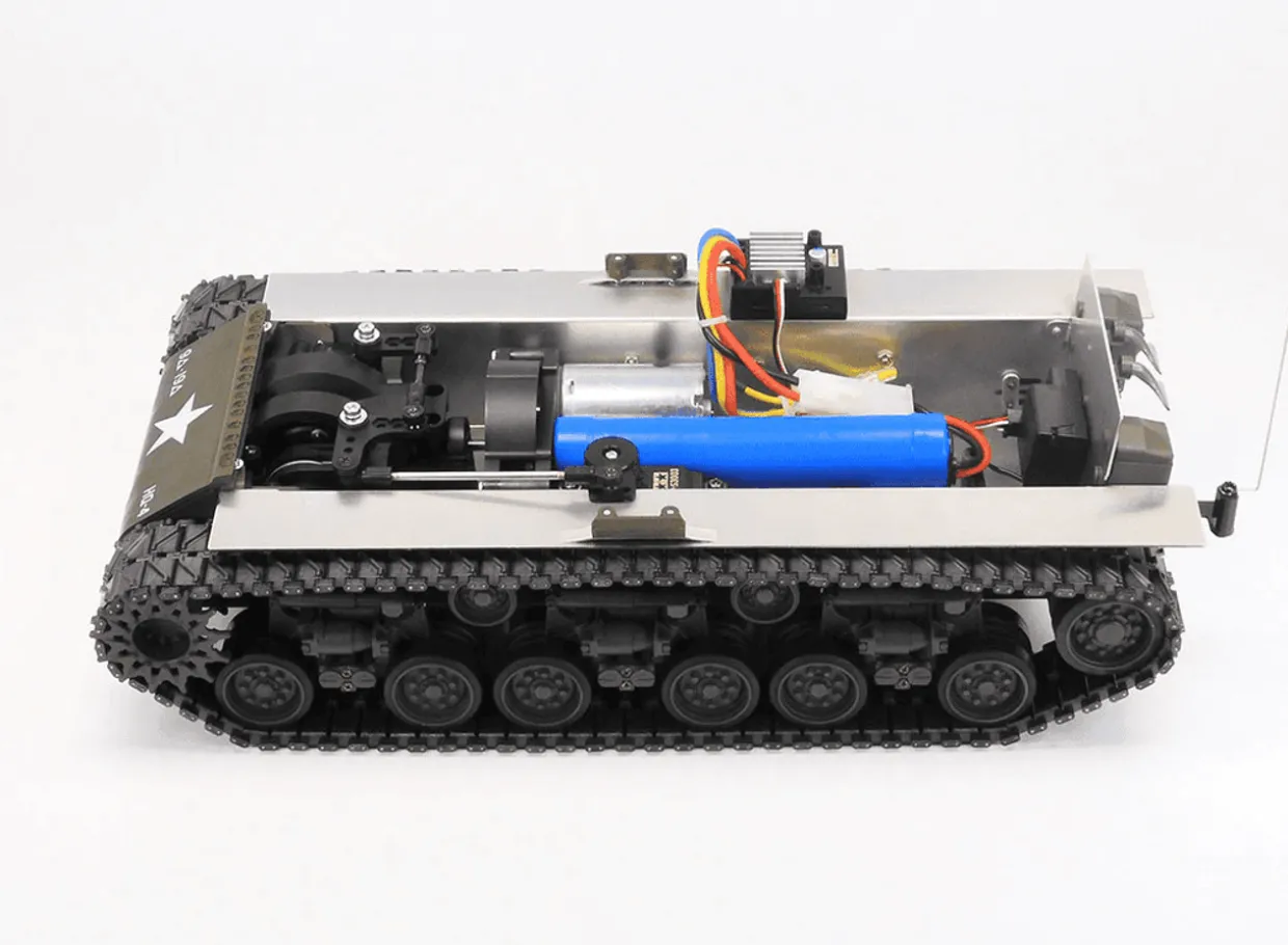 A differential gear transfers power from the centre-right type 540 motor. This controlled differential steering system features a brake disc on either side of the differential gear, which distributes power to the left and right drive sprockets: transmitter commands cause steering servo movement which in turn slows the turning side track and speeds the other track up, with the resulting difference in speeds causing the tank to turn. This system was mainly used on American tanks during WWII.