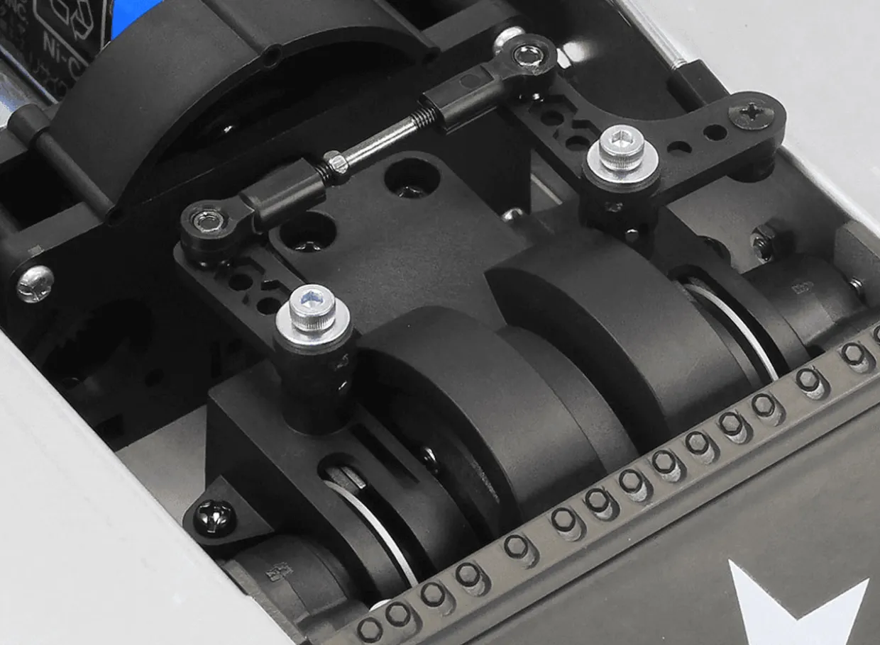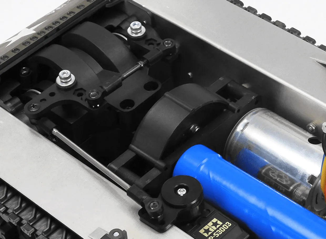 Turning circle is controlled via the steering servo and brakes. Speed control and steering operation are independent, so this tank can be controlled by a wheel-trigger type 2-channel transmitter in the same way as an R/C car is. The horizontal vertical spring suspension (HVSS) uses metal coil springs for smooth motion and ensures powerful drive, even on rough surfaces. Pre-assembled plastic tracks use metal pins and connectors.