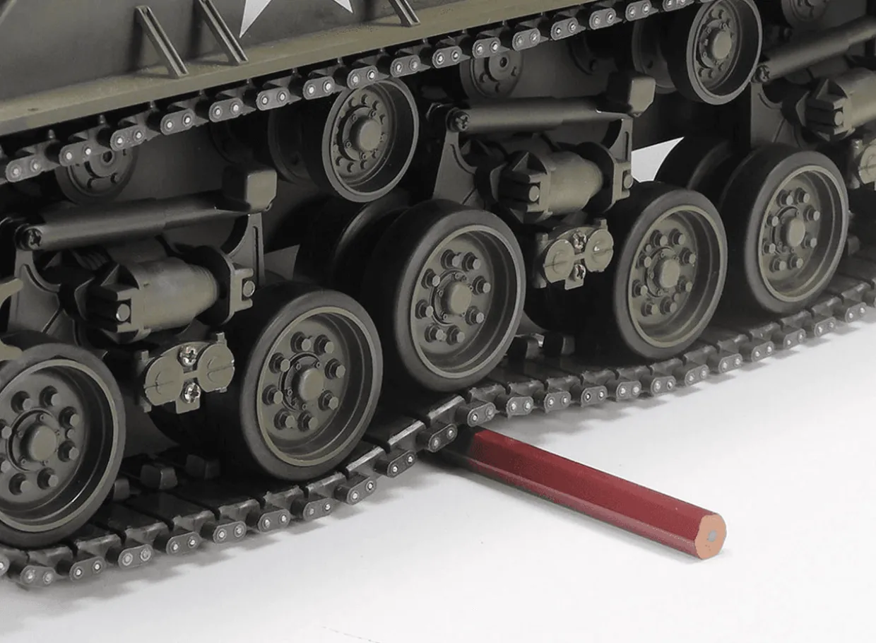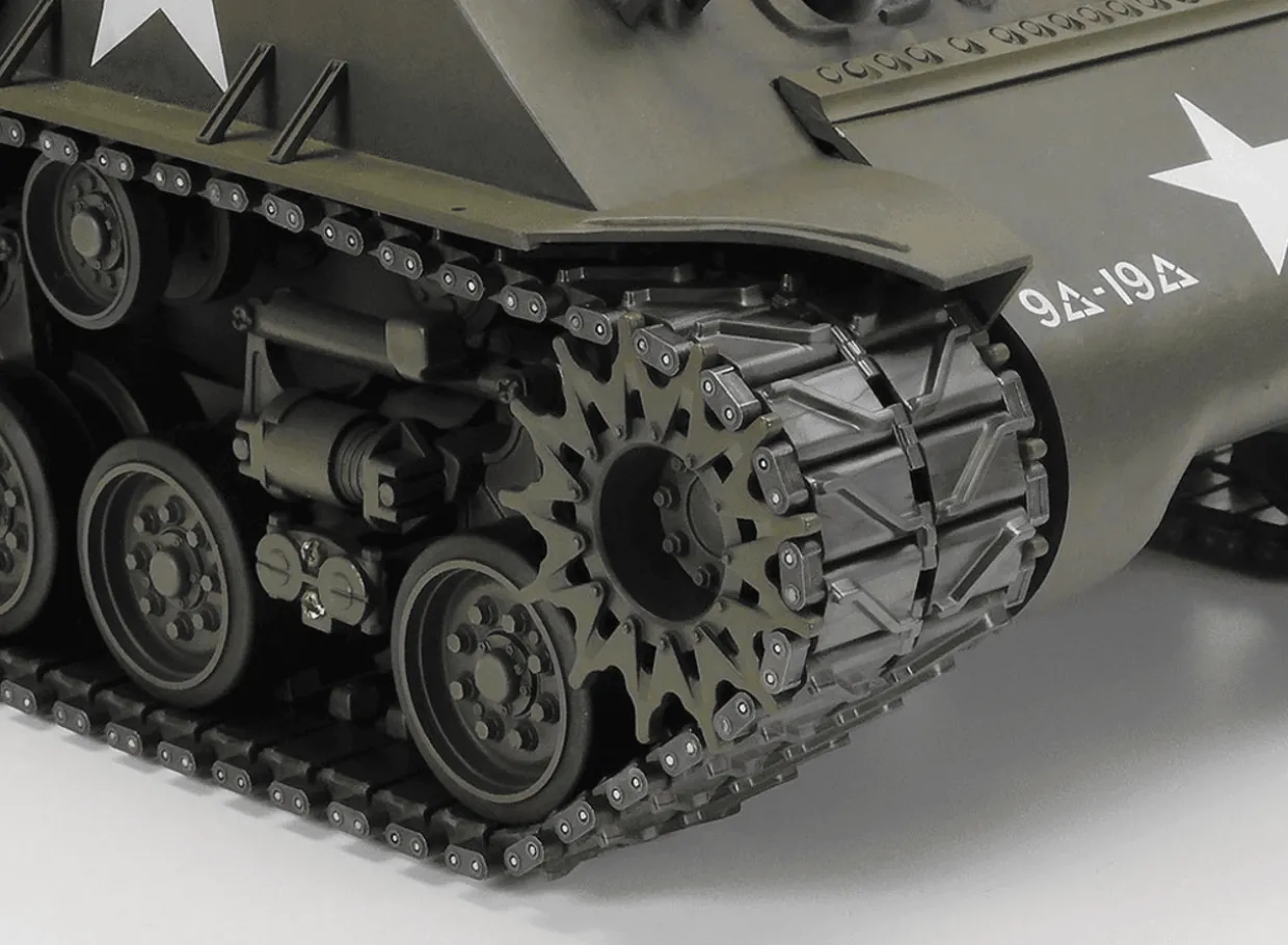 The 1/16 R/C M4 Sherman 105mm Howitzer was Tamiya’s first R/C model kit released in 1974. Now, we are delighted to announce the updated version of Item 56014 – 1/16 R/C M4 Sherman 105mm Howitzer with a new gearbox which uses one Type 540 motor (two Type 380 motors in the original kit) which recreates the controlled differential steering system of the actual tank. Generally speaking, tanks used the clutch-brake steering system – the power is disconnected from the side of turning direction with sprocket brakes and the tank turns by making differential rotations between right and left tracks. On the other hand, the M4 Sherman employed the controlled differential steering system which allows smooth turning by changing rotation speeds of right and left tracks with differential gear without disconnecting the power. While sprocket brake still works, the brake completely stops during turnings, and this system limits drive loss and brake overheating. During WWII, most American tanks featured this steering system. Enjoy the feeling of using the steering system from the actual tank, on our legendary R/C tank.