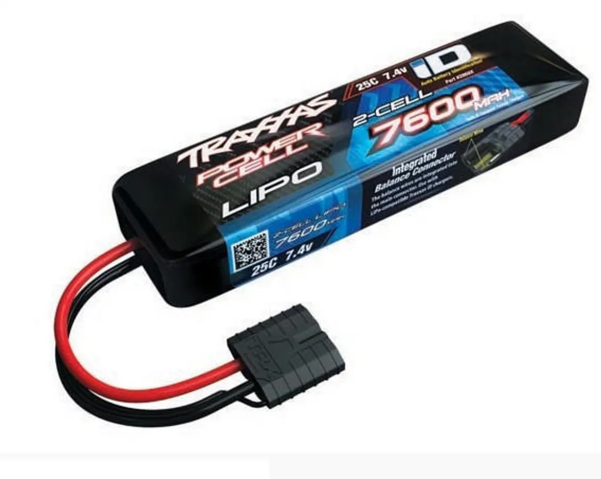 The Traxxas Power Cell iD (TRX Plug) 7600mAh 7.4v 2s 25C LiPo Battery foffer the ultimate in power, “punch,” and runtime with the highest possible capacity and voltage. 7600mAh 2-Cell LiPos provide 50% more runtime than 5000mAh, giving you more time for fast laps, jumps, and over-the-top RC fun.
