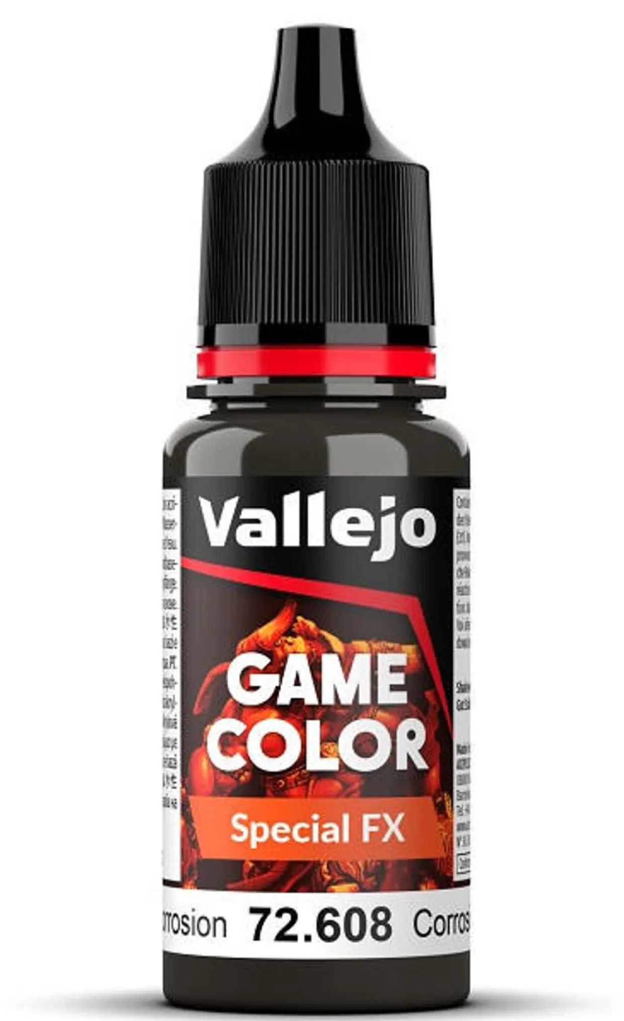 Vallejo 18ml Special FX 608 Corrosion. Acrylics colors in a matt and opaque, water based formula, especially designed for brush-on use. Each color has been meticulously developed in collaboration with model-painters who specialize in fantasy figures and dioramas.