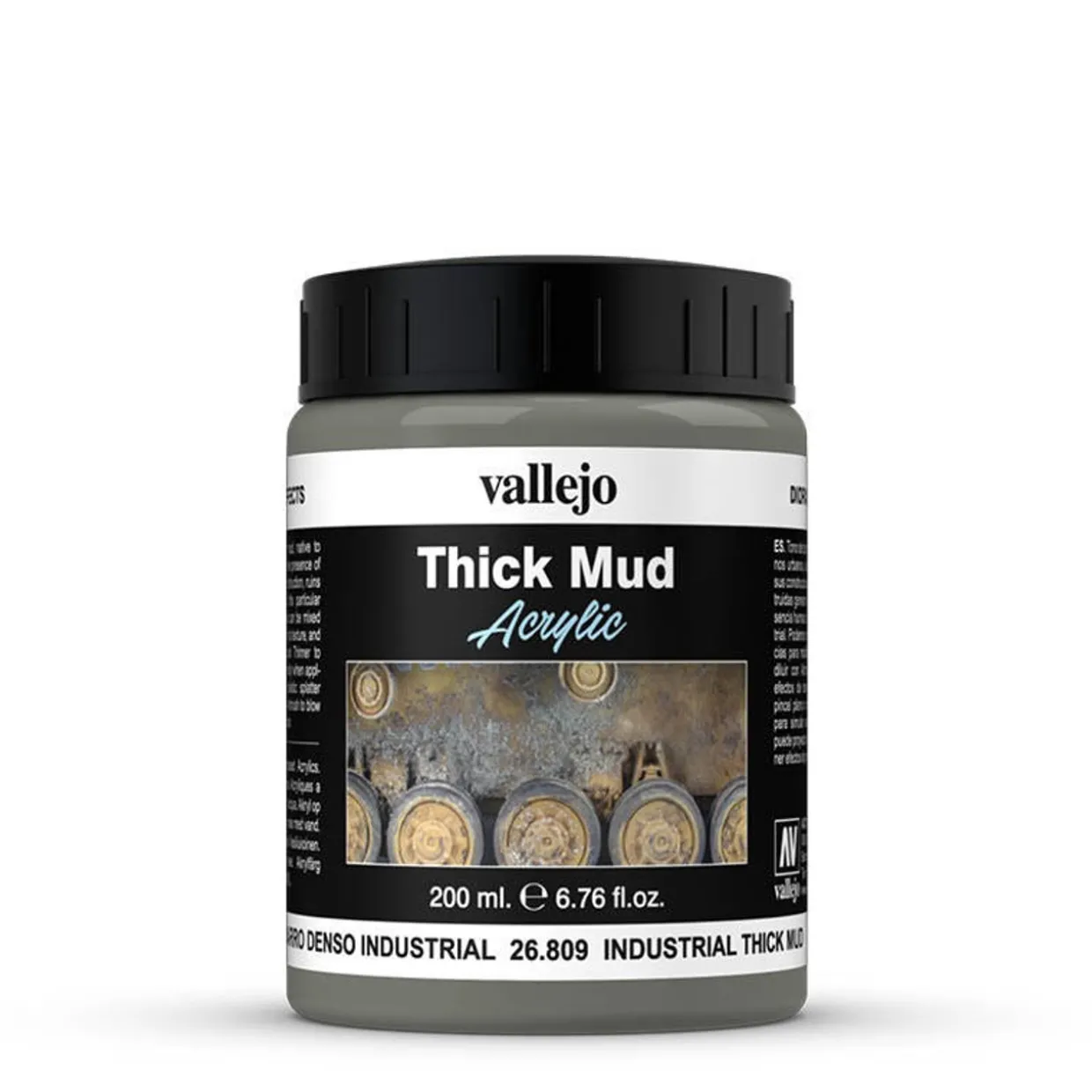 Vallejo Acrylic 200ml Industrial Thick Mud. The innovative range of Weathering Effects offers the modeler a new medium for depicting the effects of exposure to weather and extreme climates on vehicles and armor.