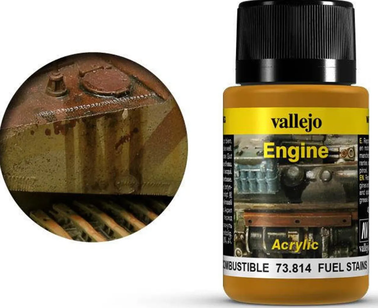 Vallejo Acrylic Weathering Effects 40ml Fuel Stains. The innovative range of Weathering Effects offers the modeler a new medium for depicting the effects of exposure to weather and extreme climates on vehicles and armor.