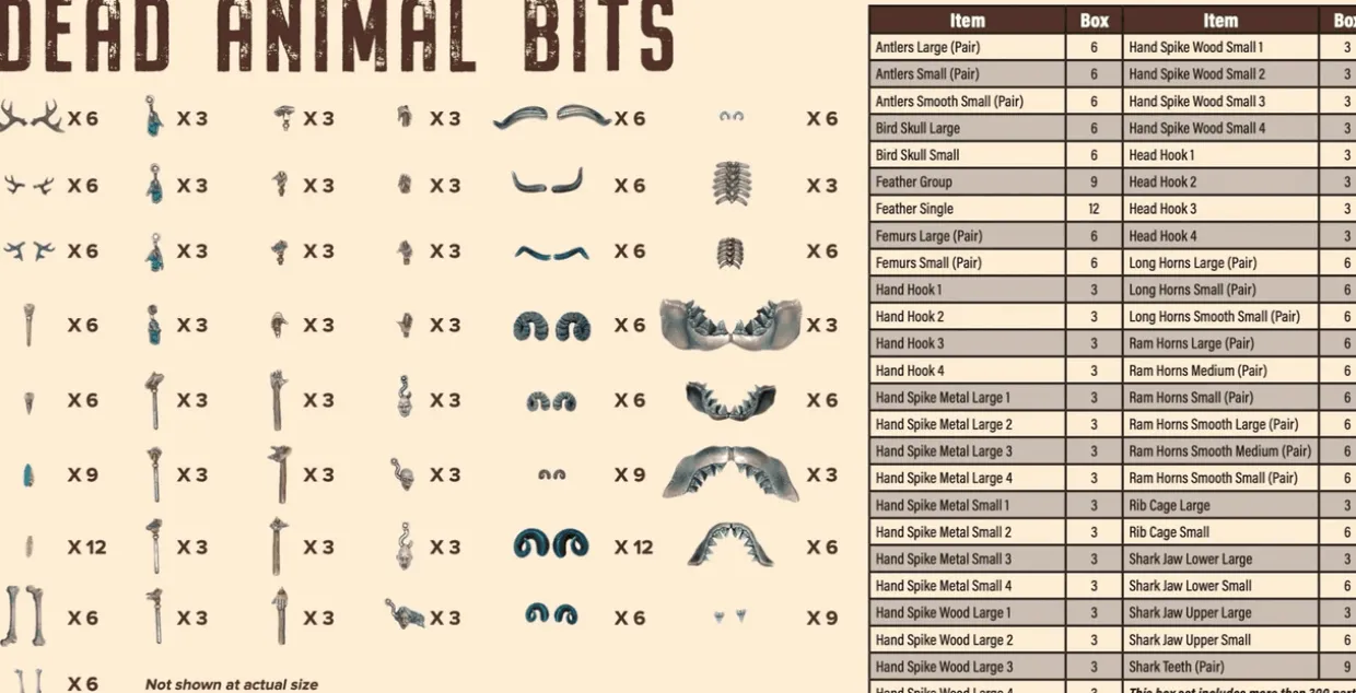 Over 300 plastic bits in this box to add to your models, bases, dioramas, and more! Everything from bones to antlers to jaws to body parts to feathers…and more and more!