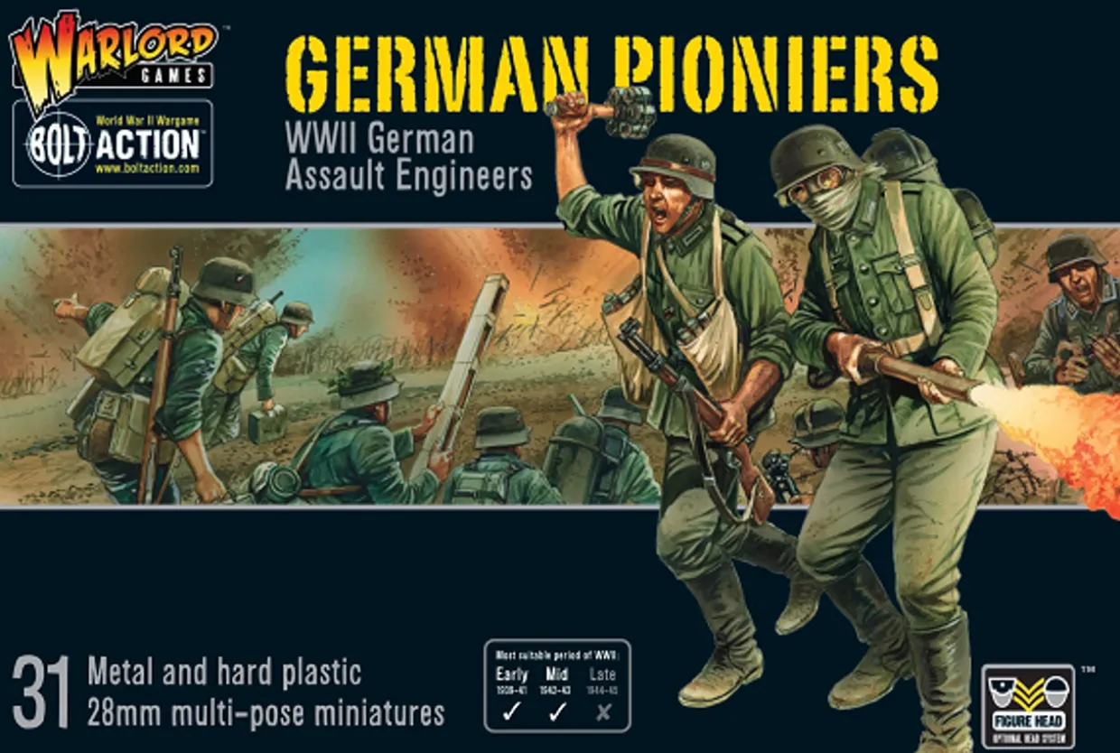 The Warlord Games 28mm Bolt Action WWII German Pioniers 1939-1943 from our 1/56 (28mm) scale figure model kits range accurately recreates the real-life soldiers. This plastic and metal model kit requires paint, and may require glue, to complete. Box includes 31 metal and plastic figures.