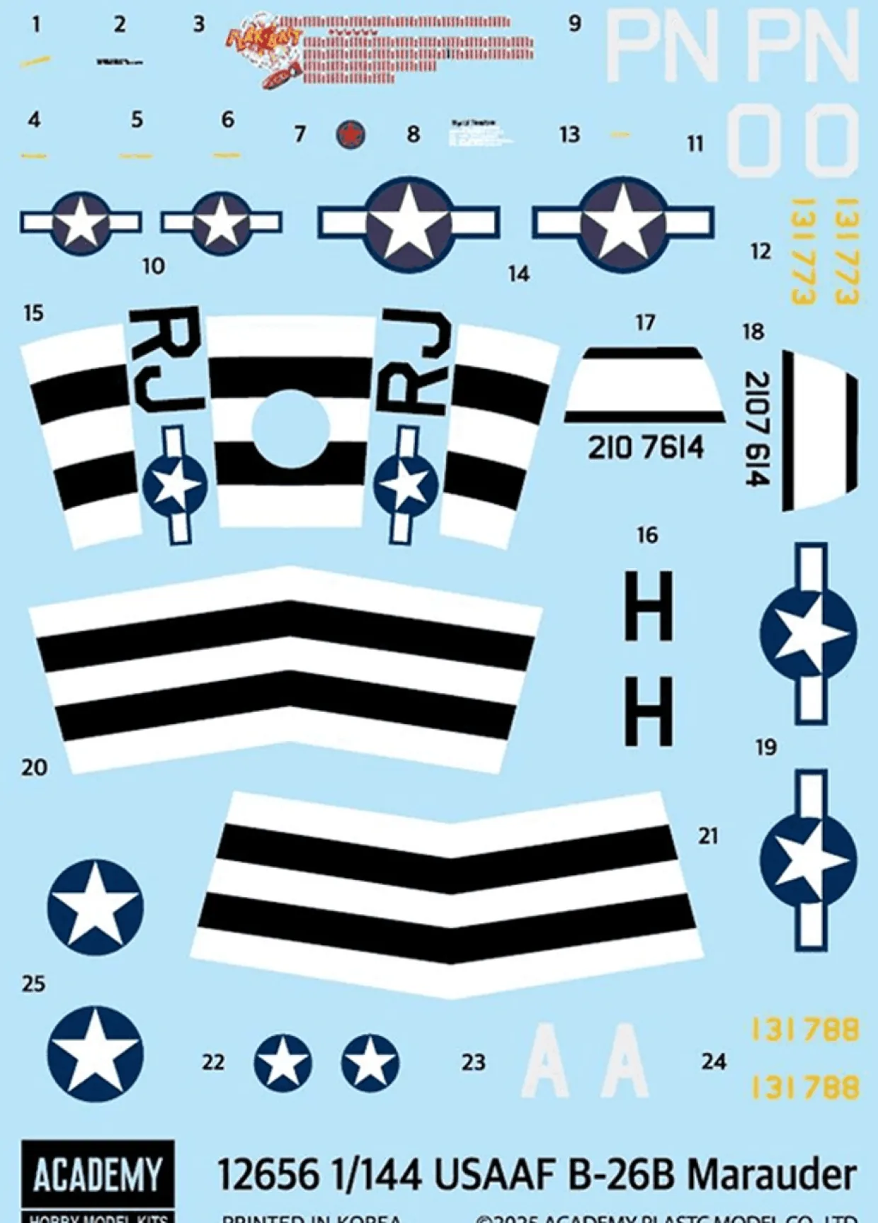 Reissued Minicraft kit. 3 sprues plus clear parts. Choice of 3 markings: (1) B-26B-25-MA Marauder 131773/PN-O “Flak-Bait” (S/N 41-31773); (2) B-26C-45-MO Marauder 2107614/RJ-H (S/N 42-107614); (3) B-26B-25-MA Marauder 31788/PN-A (S/N 41-31788).