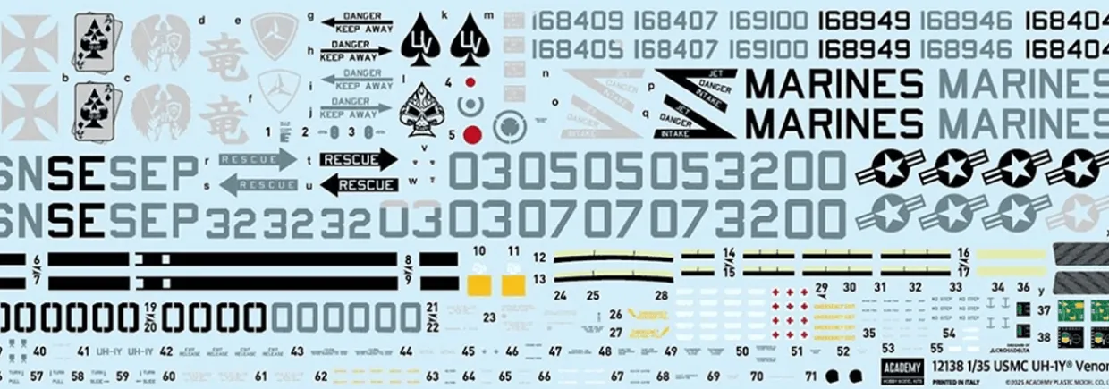 New tooling. 8 sprues with photo-etch parts and paint masks included. Select from 12.7 mm GAU-16 and GAU-17A crew-served machine guns. Boarding doors can be built open or closed. LAU-68 rocket launcher included. Folding rotor blades. Choice of 5 markings for 2017-2020 era USMC aircraft.