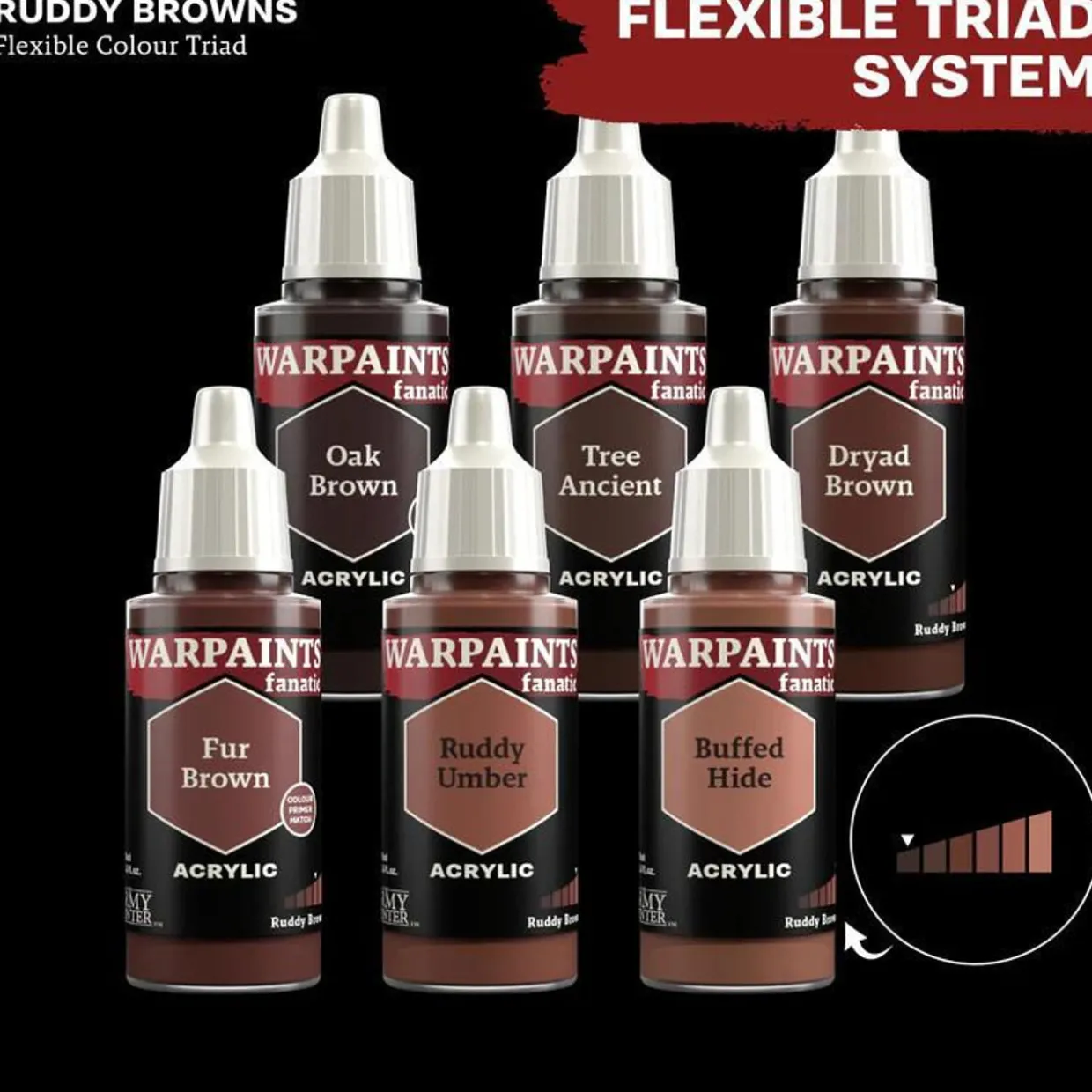 Each paint is part of a Flexible Colour Triad System: a segment, or family, of paint colours that are made using the same root colour. Inside each Flexible Colour Triad are six colours that range from dark to light with a consistent hue. With this system, you can easily select paints that create a natural colour progression on your miniatures.