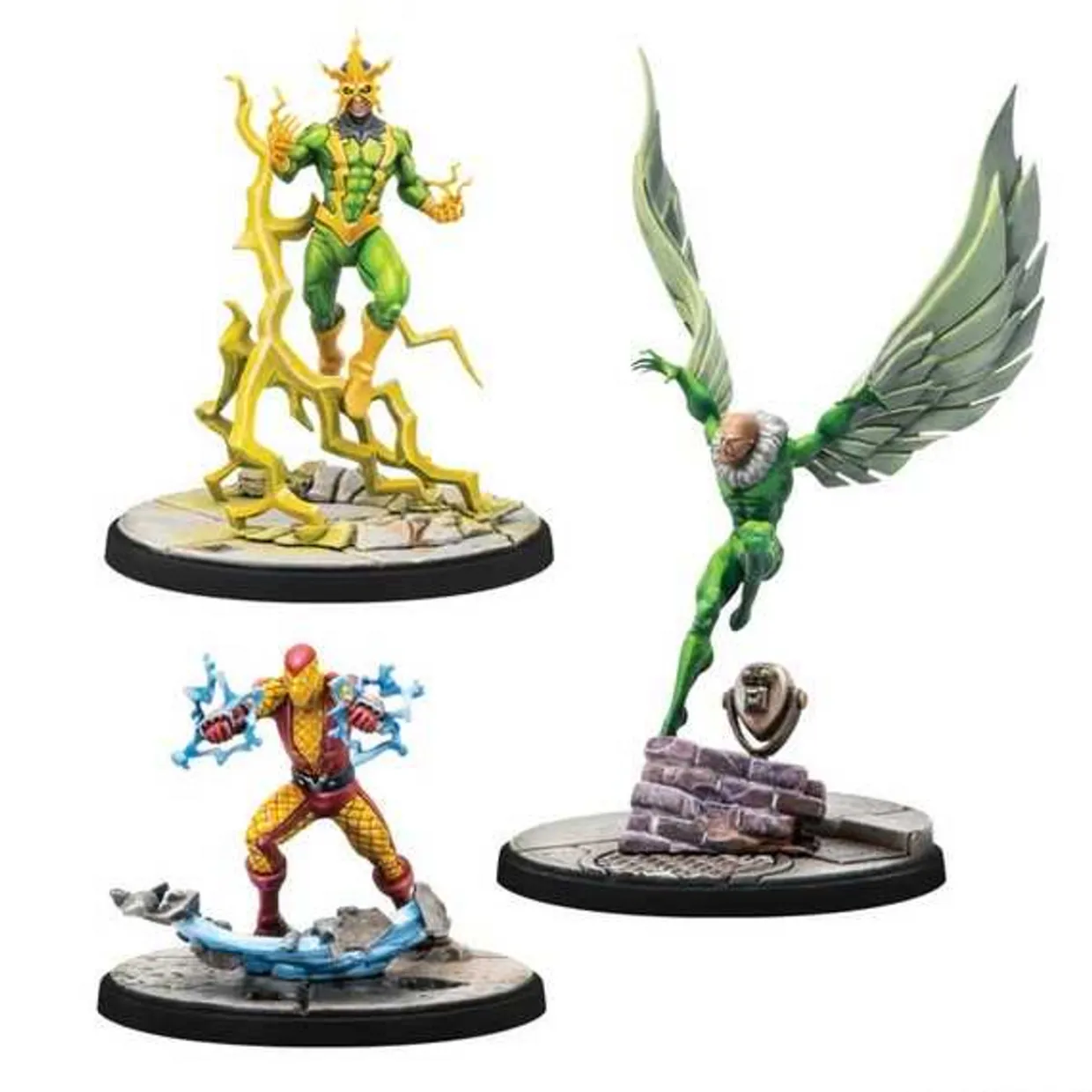 The Electro & Sandman & Shocker & Vulture from the Marvel Crisis Protocol range provides a set of highly detailed figures to add to your collection. This plastic model kit requires paint and glue to complete.
