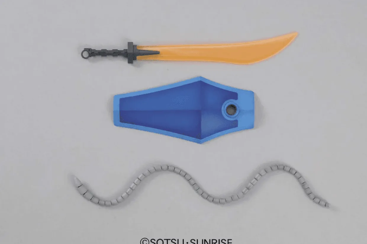 Its signature weaponry includes a shield, a Heat Saber, a Heat Rod, and a Finger Vulcan for its left hand. A regular manipulator left hand is also included to replace the Finger Vulcan if you so desire. Each section of the Heat Rod is ball-jointed so you can bend it into any shape you want! The blade part of the Heat Saber is made of clear orange, and the Mobile Suit’s cockpit can slide open to reveal a sitting-pose pilot figure (molded in light blue). Also packed in the set are in-scale figures (molded in light blue) of Ramba Ral and his aide Crowley Hamon. A sheet of stickers and dry-transfer markings are included.