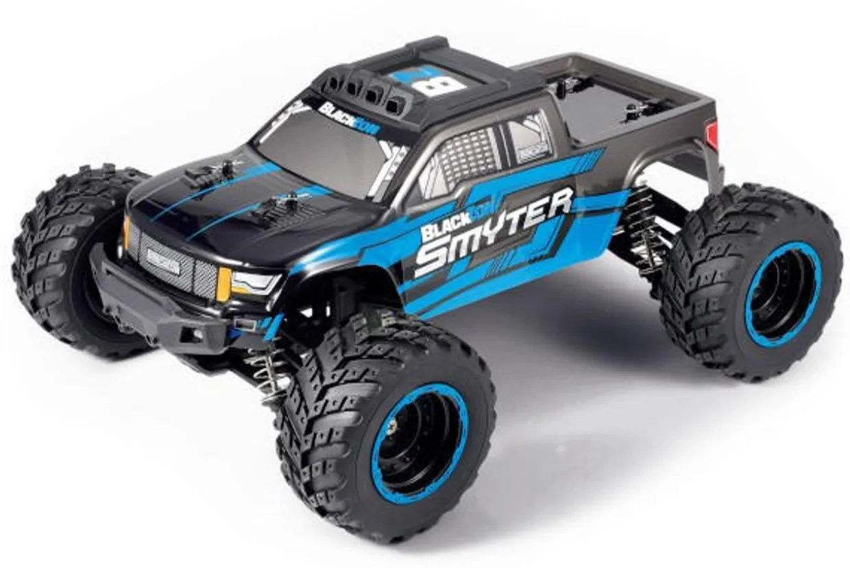 The BlackZon Smyter MT is a 1/12 scale 4WD electric monster truck from our radio-controlled monster trucks and crawlers is ideal for RC enthusiasts seeking power, agility, and performance. Perfect for stunts and off-road fun, it features a durable 4WD shaft drivetrain, independent double wishbone suspension, and adjustable coil-over shocks. Designed for any terrain, it’s equipped with waterproof electronics, a protective gear cover, and a robust servo-saver system. Comes with a 7.4V 1500mAh Li-Ion battery, USB charger, and optional LED lights for night driving.