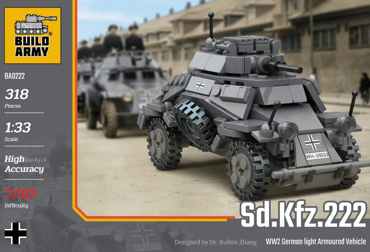 The 1/33 Sd.Kfz.222 Armoured Car from our construction toys range recreates the real-world German armoured car from World War II.