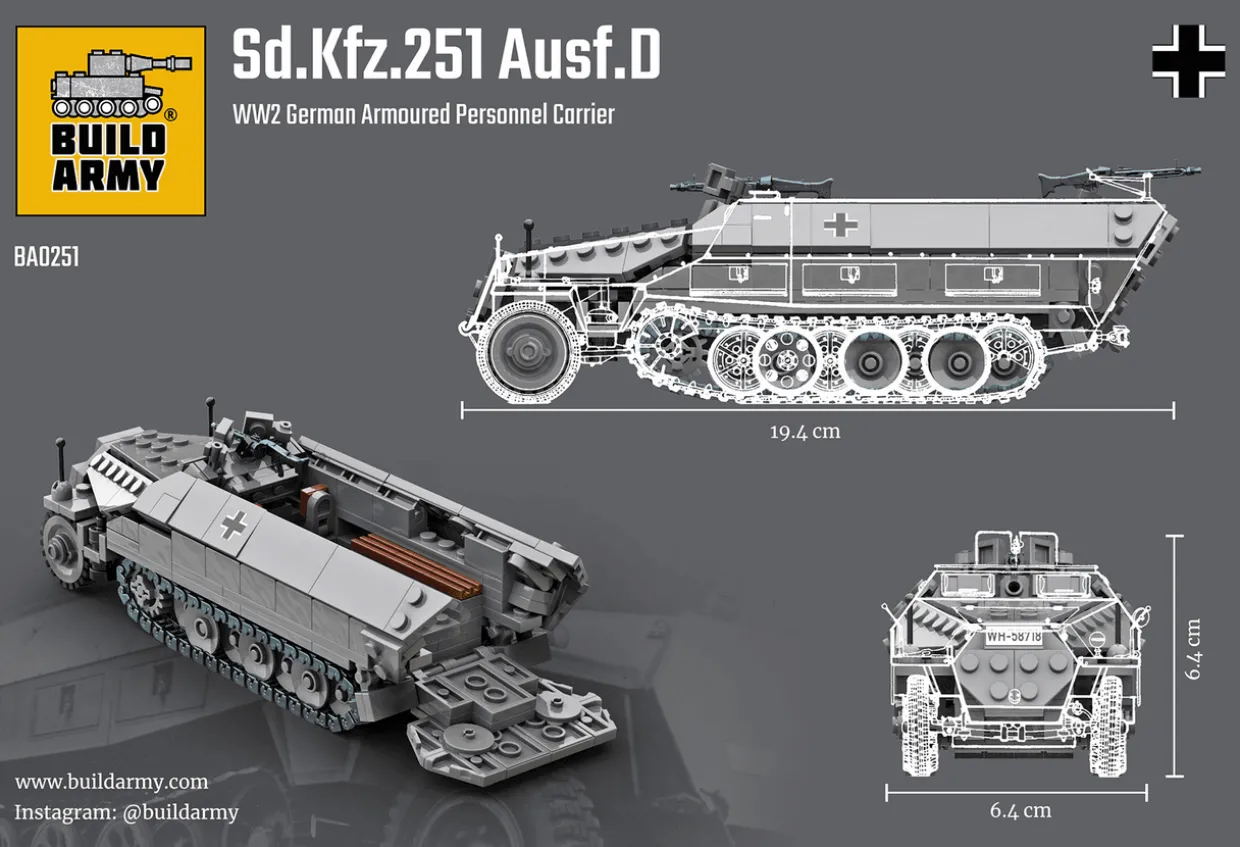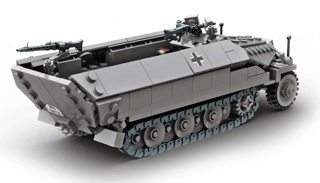 The 1/33 Sd.Kfz.251 Ausf.D Half-track from our construction toys range recreates the real-world German armoured car from World War II.