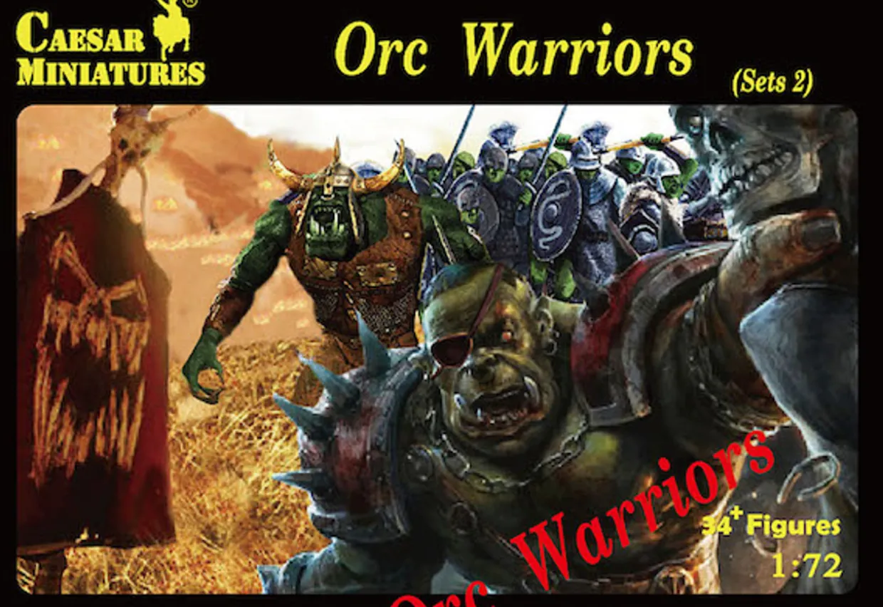 The Caesar Miniatures 1/72 Fantasy Orc Warriors Set 2 from our 1/72 and 1/76 scale figure model kits range pfovides a set of highly detailed fantasy figures. This plastic model kit requires paint, and may require glue, to complete.