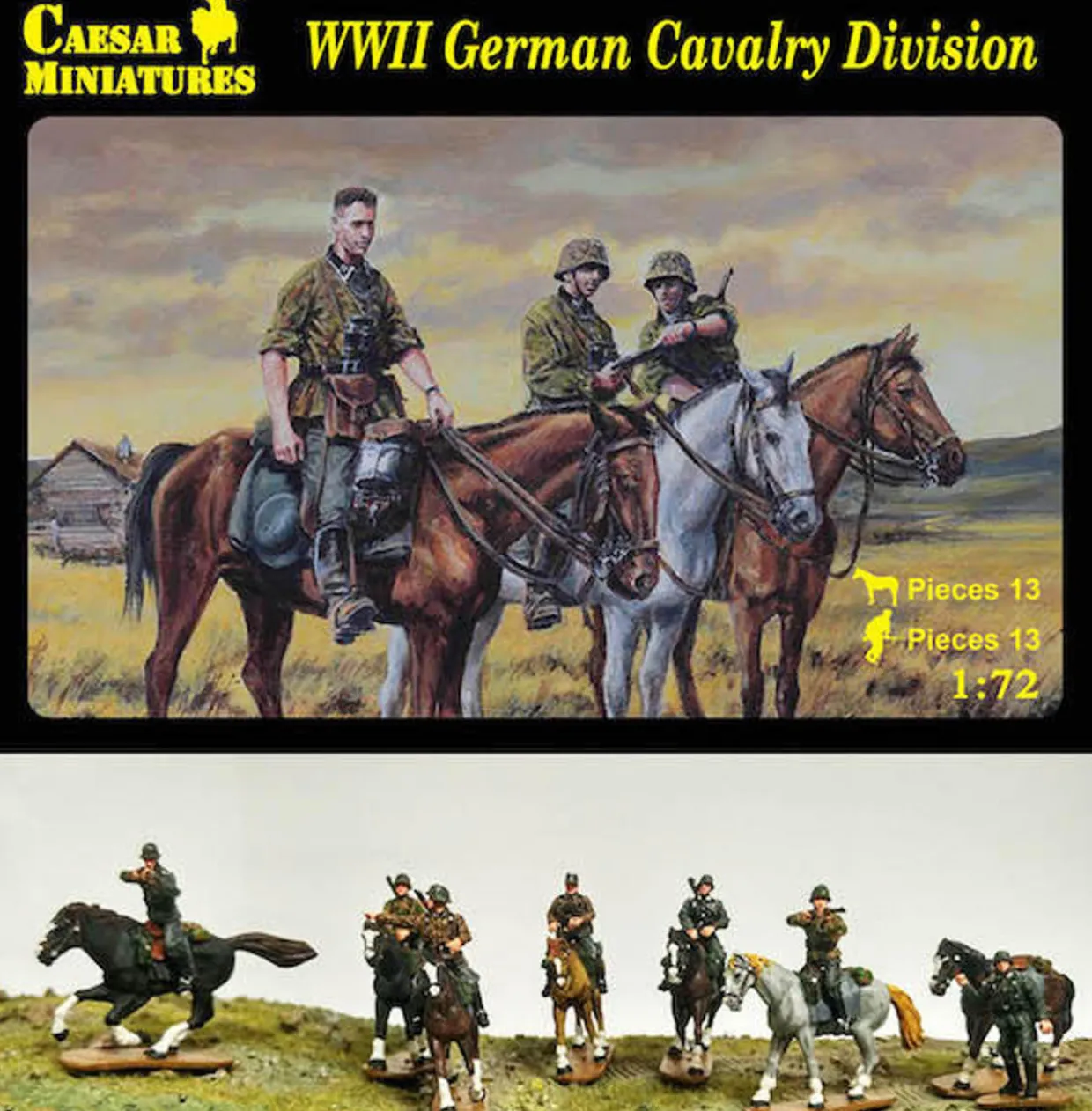 The Caesar Miniatures 1/72 German Cavalry Division WWII from our 1/72 and 1/76 scale figure model kits range accurately recreates the real-life German mounted soldiers from World War II. This figures set includes 26 unpainted plastic figures. This plastic model kit requires paint, and may require glue, to complete.