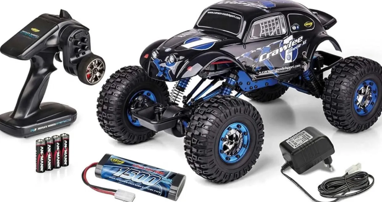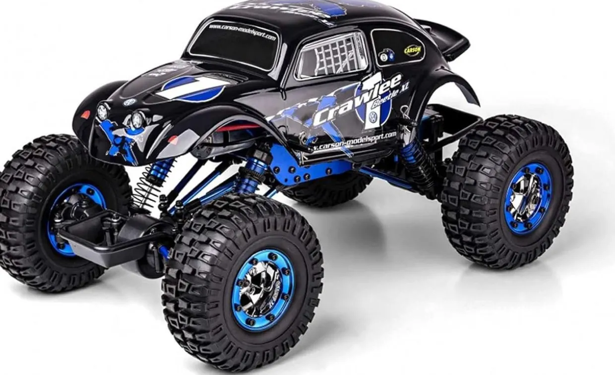 The Carson X-Crawlee XL Beetle has an extremely off-road trial chassis for long climbs. Thanks to radically traversable axles, rigid drives and bolted beadlock tires, the crawler can conquer almost any obstacle. Numerous blue anodized aluminum parts, such as the adjustable oil pressure shock absorbers reduce the weight and together with the robust body for a cool look. The ready-to-drive X-Crawlee XL Beetle is ready to go right out of the box, a battery and a charger as standard. Ready to use model.