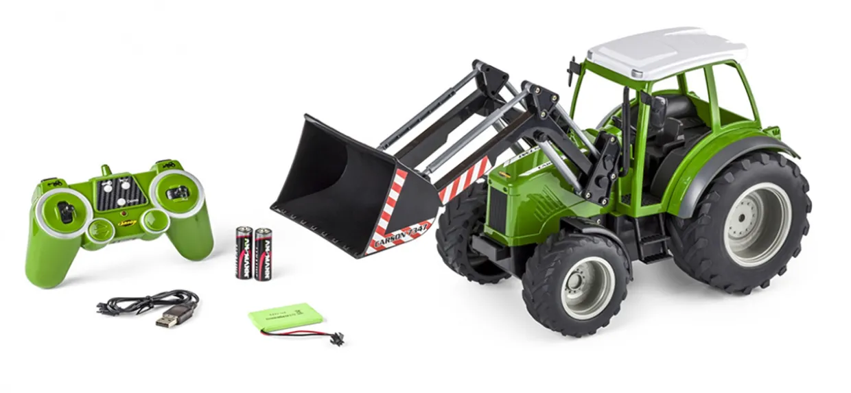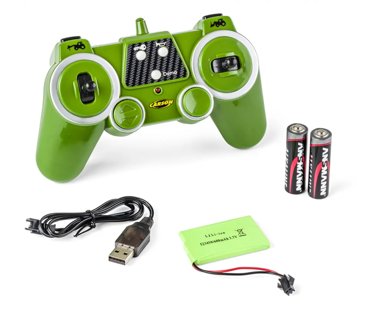 The Carson 1/16 RC Tractor with Font Loader from our radio controlled tractors and farm machinery range includes many details with the latest technology such as the interference-free 2.4 GHz multi-channel remote control, sound, light and engine sounds. The non-slip rubber tyres have a true-to-the-original tread pattern. The remote control system is used to remotely control functions such as lights, horn and engine sound.