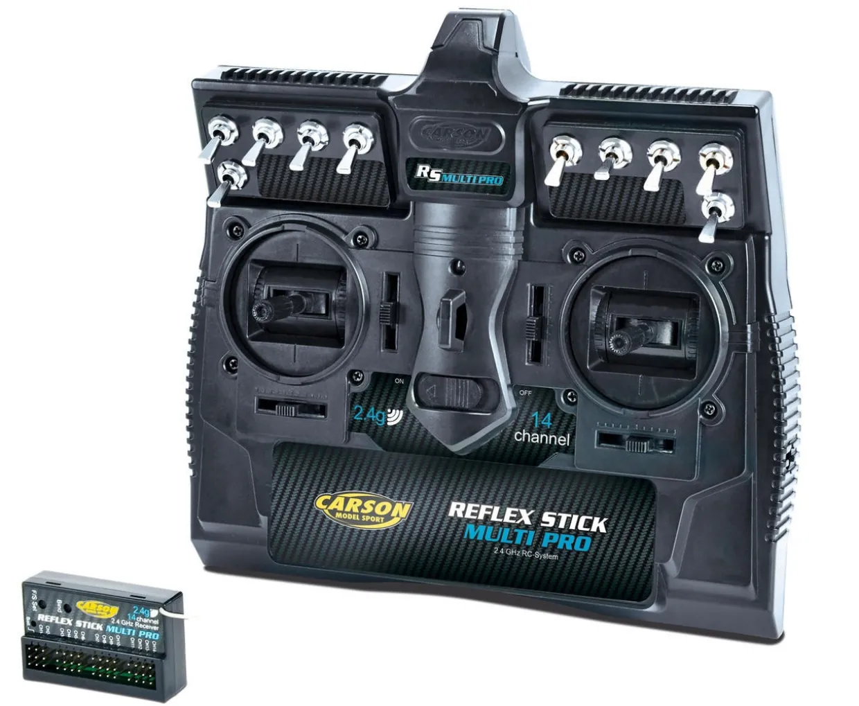 The Carson Reflex Stick 14 Channel 2.4Ghz Radio Set is ideal for Tamiya RC tanks and Radio Controlled trucks.